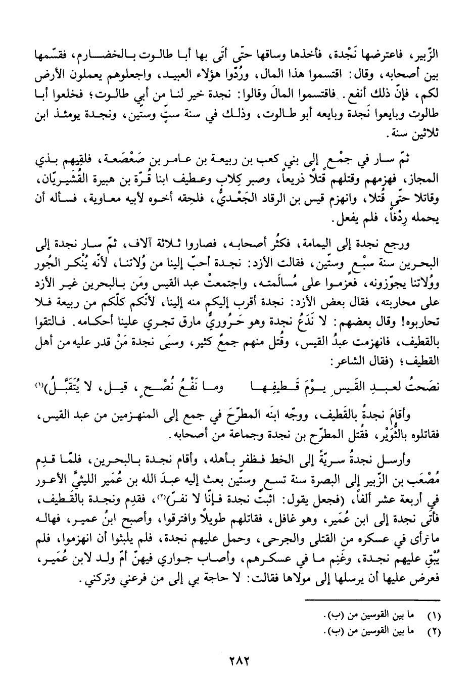 وَأَرْسَلَ نَجْدَةُ سَرِيَّةً إِلَى الْخَطِّ فَظَفِرَ بِأَهْلِهِ، وَأَقَامَ نَجْدَةُ بِالْبَحْرَيْنِ. فَلَمَّا قَدِمَ مُصْعَبُ بْنُ الزُّبَيْرِ إِلَى الْبَصْرَةِ سَنَةَ تِسْعٍ وَسِتِّينَ بَعَثَ إِلَيْهِ عَبْدَ اللَّهِ بْنَ عُمَيْرٍ اللَّيْثِيَّ الْأَعْوَرَ فِي أَرْبَعَةَ عَشَرَ أَلْفًا (فَجَعَلَ يَقُولُ: اثْبُتْ نَجْدَةُ فَإِنَّا لَا نَفِرُّ) ، فَقَدِمَ وَنَجْدَةُ بِالْقَطِيفِ، فَأَتَى نَجْدَةُ إِلَى ابْنِ عُمَيْرٍ، وَهُوَ غَافِلٌ، فَقَاتَلَ طَوِيلًا وَافْتَرَقُوا، وَأَصْبَحَ ابْنُ عُمَيْرٍ فَهَالَهُ مَا رَأَى فِي عَسْكَرِهِ مِنَ الْقَتْلَى وَالْجَرْحَى، وَحَمَلَ عَلَيْهِمْ نَجْدَةُ فَلَمْ يَلْبَثُوا أَنِ انْهَزَمُوا، فَلَمْ يُبْقِ عَلَيْهِمْ نَجْدَةُ وَغَنِمَ مَا فِي عَسْكَرِهِمْ وَأَصَابَ جِوَارِيَ فِيهِنَّ أُمُّ وَلَدٍ لِابْنِ عُمَيْرٍ، فَعَرَضَ عَلَيْهَا أَنْ يُرْسِلَهَا إِلَى مَوْلَاهَا فَقَالَتْ: لَا حَاجَةَ بِي إِلَى مَنْ فَرَعَنِي وَتَرَكَنِي.