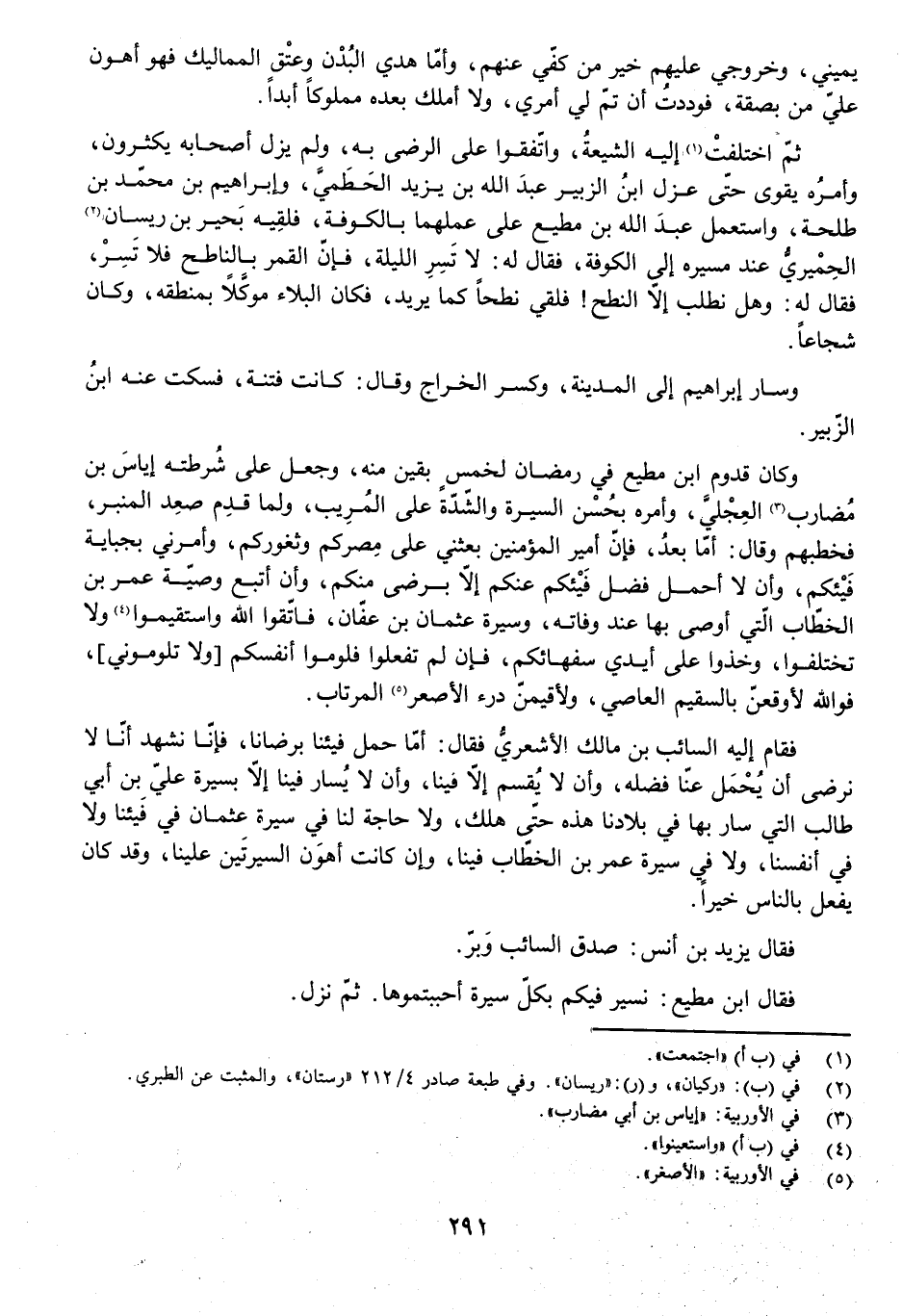 فَقَامَ إِلَيْهِ السَّائِبُ بْنُ مَالِكٍ الْأَشْعَرِيُّ فَقَالَ: أَمَّا حَمْلُ فَيْئِنَا بِرِضَانَا فَإِنَّا نَشْهَدُ أَنَا لَا نَرْضَى أَنْ يُحْمَلَ عَنَّا فَضْلُهُ وَأَنْ لَا يُقْسَمَ إِلَّا فِينَا، وَأَنْ لَا يُسَارَ فِينَا إِلَّا بِسِيرَةِ عَلِيِّ بْنِ أَبِي طَالِبٍ الَّتِي سَارَ بِهَا فِي بِلَادِنَا هَذِهِ حَتَّى هَلَكَ، وَلَا حَاجَةَ لَنَا فِي سِيرَةِ عُثْمَانَ فِي فَيْئِنَا وَلَا فِي أَنْفُسِنَا، وَلَا فِي سِيرَةِ عُمَرَ بْنِ الْخَطَّابِ فِينَا، وَإِنْ كَانَتْ أَهْوَنَ السِّيرَتَيْنِ عَلَيْنَا، وَقَدْ كَانَ يَفْعَلُ بِالنَّاسِ خَيْرًا.