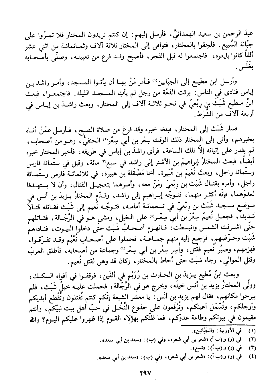 فَسَارَ شَبَثٌ إِلَى الْمُخْتَارِ، فَبَلَغَهُ خَبَرُهُ وَقَدْ فَرَغَ مِنْ صَلَاةِ الصُّبْحِ، فَأَرْسَلَ مَنْ أَتَاهُ بِخَبَرِهِمْ، وَأَتَى إِلَى الْمُخْتَارِ ذَلِكَ الْوَقْتَ سِعْرُ بْنُ أَبِي سِعْرٍ الْحَنَفِيُّ، وَهُوَ مِنْ أَصْحَابِهِ، لَمْ يَقْدِرْ عَلَى إِتْيَانِهِ إِلَّا تِلْكَ السَّاعَةَ، فَرَأَى رَاشِدَ بْنَ إِيَاسٍ فِي طَرِيقِهِ فَأَخْبَرَ الْمُخْتَارَ خَبَرَهُ أَيْضًا، فَبَعَثَ الْمُخْتَارُ إِبْرَاهِيمَ بْنَ الْأَشْتَرِ إِلَى رَاشِدٍ فِي سَبْعِ مِائَةٍ، وَقِيلَ فِي سِتِّمِائَةِ فَارِسٍ وَسِتِّمِائَةِ رَاجِلٍ، وَبَعَثَ نُعَيْمَ بْنَ هُبَيْرَةَ، أَخَا مَصْقَلَةَ بْنِ هُبَيْرَةَ، فِي ثَلَاثِمِائَةِ فَارِسٍ وَسِتِّمِائَةِ رَاجِلٍ وَأَمَرَهُ بِقِتَالِ شَبَثِ بْنِ رِبْعِيٍّ وَمَنْ مَعَهُ، وَأَمَرَهُمَا بِتَعْجِيلِ الْقِتَالِ وَأَنْ لَا يُسْتَهْدَفَا لِعَدُوِّهِمَا فَإِنَّهُ أَكْثَرُ مِنْهُمَا، فَتَوَجَّهَ إِبْرَاهِيمُ إِلَى رَاشِدٍ، وَقَدَّمَ الْمُخْتَارُ يَزِيدَ بْنَ أَنَسٍ فِي مَوْضِعِ مَسْجِدِ شَبَثِ بْنِ رِبْعِيٍّ فِي تِسْعِمِائَةٍ أَمَامَهُ، فَتَوَجَّهَ نُعَيْمٌ إِلَى شَبَثٍ فَقَاتَلَهُ قِتَالًا شَدِيدًا، فَجَعَلَ نُعَيْمٌ سِعْرَ بْنَ أَبِي سِعْرٍ عَلَى الْخَيْلِ وَمَشَى هُوَ فِي الرَّجَّالَةِ فَقَاتَلَهُمْ حَتَّى أَشْرَقَتِ الشَّمْسُ وَانْبَسَطَتْ، فَانْهَزَمَ أَصْحَابُ شَبَثٍ حَتَّى دَخَلُوا الْبُيُوتَ، فَنَادَاهُمْ شَبَثٌ وَحَرَّضَهُمْ، فَرَجَعَ إِلَيْهِ مِنْهُمْ جَمَاعَةٌ، فَحَمَلُوا عَلَى أَصْحَابِ نُعَيْمٍ وَقَدْ تَفَرَّقُوا، فَهَزَمَهُمْ، وَصَبَرَ نُعَيْمٌ فَقُتِلَ، وَأَسِرُ سِعْرُ بْنُ أَبِي سِعْرٍ وَجَمَاعَةٌ مِنْ أَصْحَابِهِ، فَأَطْلَقَ الْعَرَبَ وَقَتَلَ الْمَوَالِي، وَجَاءَ شَبَثٌ حَتَّى أَحَاطَ بِالْمُخْتَارِ، وَكَانَ قَدْ وَهَنَ لِقَتْلِ نُعَيْمٍ.