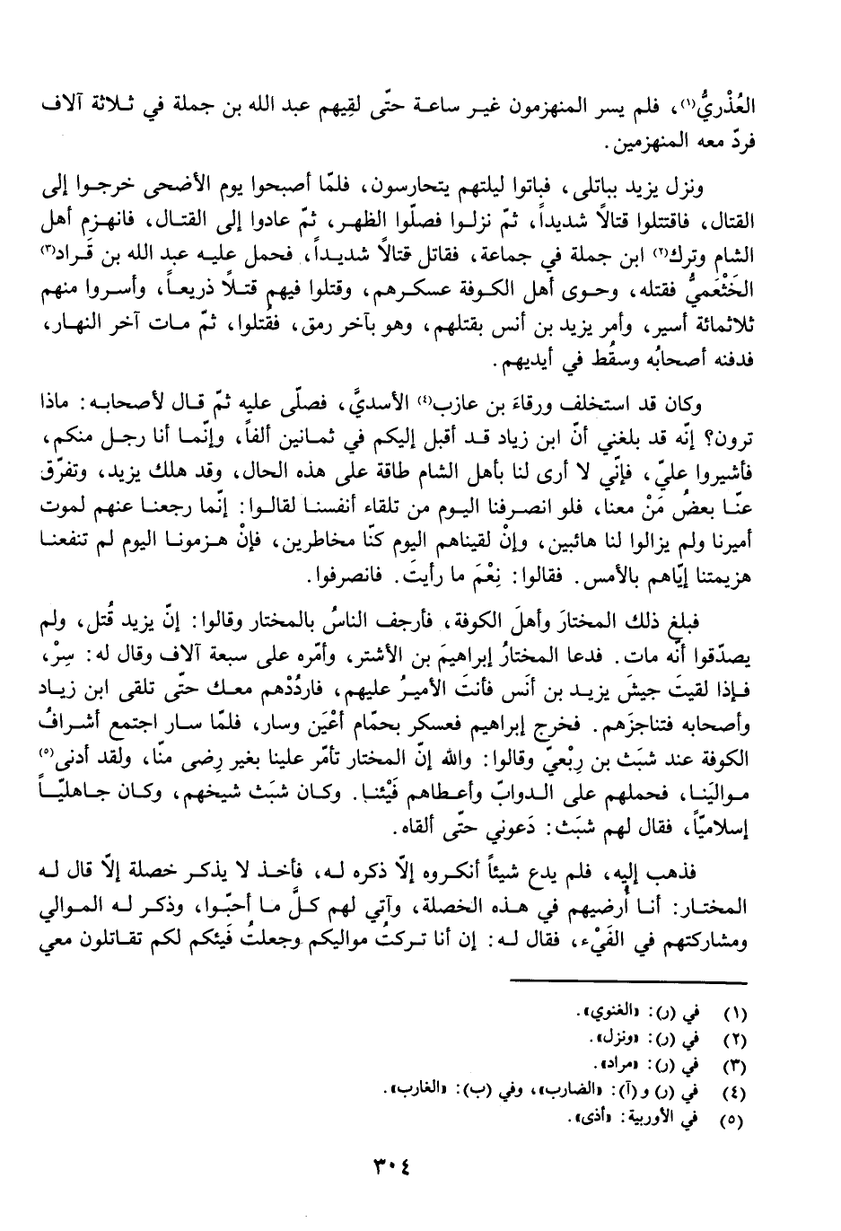فَذَهَبَ إِلَيْهِ، فَلَمْ يَدَعْ شَيْئًا أَنْكَرُوهُ إِلَّا ذَكَرَهُ لَهُ، فَأَخَذَ لَا يَذْكُرُ خَصْلَةً إِلَّا قَالَ لَهُ الْمُخْتَارُ: أَنَا أُرْضِيهِمْ فِي هَذِهِ الْخَصْلَةِ، وَآتِي لَهُمْ كُلَّ مَا أَحَبُّوا. وَذَكَرَ لَهُ الْمَوَالِيَ وَمُشَارَكَتَهُمْ فِي الْفَيْءِ، فَقَالَ لَهُ: إِنْ أَنَا تَرَكْتُ مَوَالِيَكُمْ، وَجَعَلْتُ فَيْئَكُمْ لَكُمْ، تُقَاتِلُونَ مَعِي