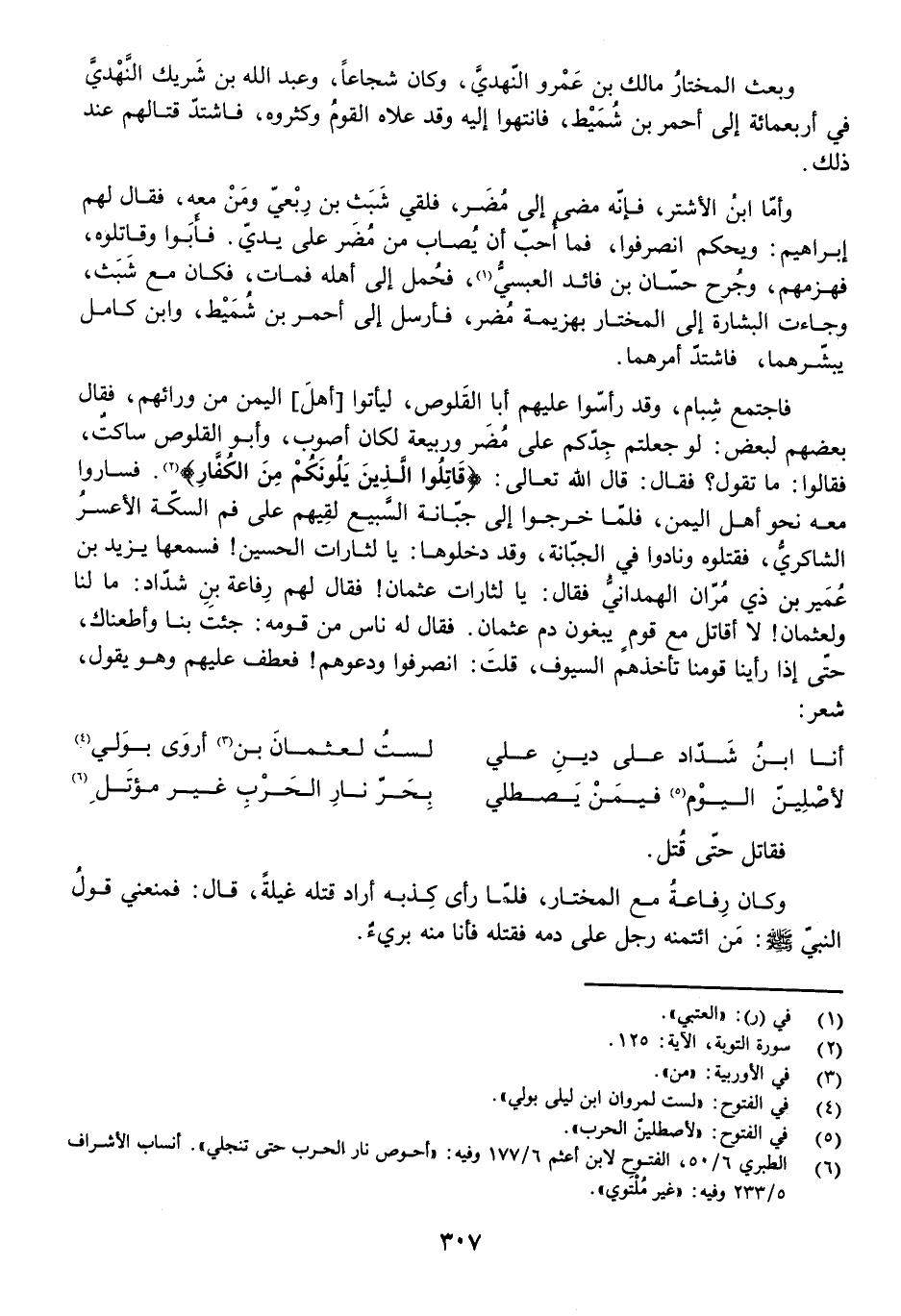 فَاجْتَمَعَ شِبَامٌ، وَقَدْ رَأَّسُوا عَلَيْهِمْ أَبَا الْقَلُوصِ، لِيَأْتُوا أَهْلَ الْيَمَنِ مِنْ وَرَائِهِمْ، فَقَالَ بَعْضُهُمْ لِبَعْضٍ: لَوْ جَعَلْتُمْ جِدَّكُمْ عَلَى مُضَرَ وَرَبِيعَةَ لَكَانَ أَصْوَبَ، وَأَبُو الْقَلُوصِ سَاكِتٌ، فَقَالُوا: مَا تَقُولُ؟ فَقَالَ: قَالَ اللَّهُ - تَعَالَى -: {قَاتِلُوا الَّذِينَ يَلُونَكُمْ مِنَ الْكُفَّارِ} [التوبة: 123] . فَسَارُوا مَعَهُ نَحْوَ أَهْلِ الْيَمَنِ، فَلَمَّا خَرَجُوا إِلَى جَبَّانَةِ السَّبِيعِ لَقِيَهُمْ عَلَى فَمِ السِّكَّةِ الْأَعْسَرُ الشَّاكِرِيُّ، فَقَتَلُوهُ وَنَادُوا فِي الْجَبَّانَةِ، وَقَدْ دَخَلُوهَا: يَا لِثَارَاتِ الْحُسَيْنِ! فَسَمِعَهَا يَزِيدُ بْنُ عُمَيْرِ بْنِ ذِي مُرَّانَ الْهَمْدَانِيُّ فَقَالَ: يَا لِثَارَاتِ عُثْمَانَ! فَقَالَ لَهُمْ رِفَاعَةُ بْنُ شَدَّادٍ: مَا لَنَا وَلِعُثْمَانَ! لَا أُقَاتِلُ مَعَ قَوْمٍ يَبْغُونَ دَمَ عُثْمَانَ. فَقَالَ لَهُ نَاسٌ مِنْ قَوْمِهِ: جِئْتَ بِنَا وَأَطَعْنَاكَ، حَتَّى إِذَا رَأَيْنَا قَوْمَنَا تَأْخُذُهُمُ السُّيُوفُ قُلْتَ: انْصَرِفُوا وَدَعُوهُمْ! فَعَطَفَ عَلَيْهِمْ وَهُوَ يَقُولُ، شِعْرٌ: