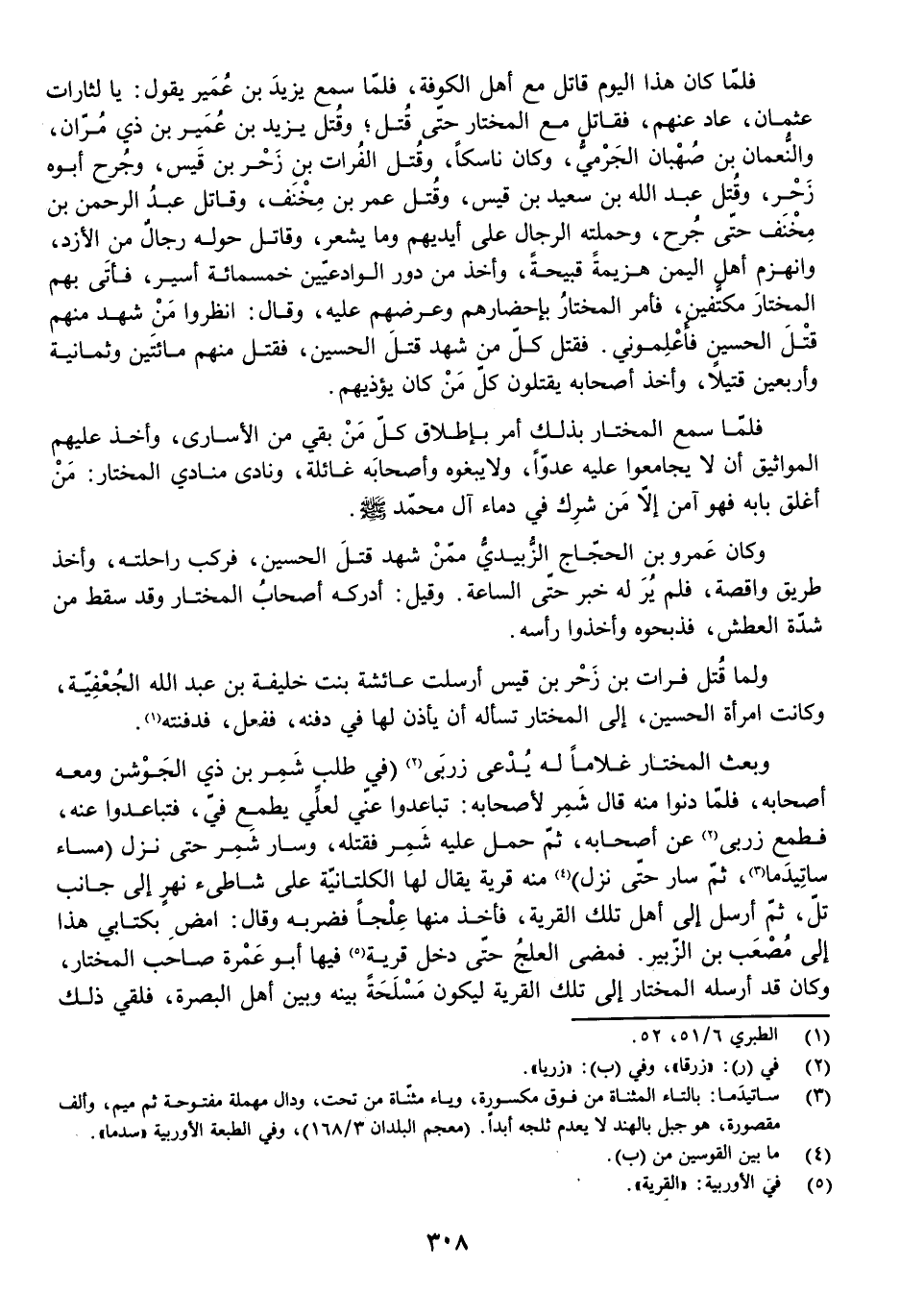 وَبَعَثَ الْمُخْتَارُ غُلَامًا لَهُ يُدْعَى زُرْبَى (فِي طَلَبِ شَمِرِ بْنِ ذِي الْجَوْشَنِ وَمَعَهُ أَصْحَابُهُ، فَلَمَّا دَنَوْا مِنْهُ قَالَ شَمِرٌ لِأَصْحَابِهِ: تَبَاعَدُوا عَنِّي، لَعَلِّي يَطْمَعُ فِيَّ، فَتَبَاعَدُوا عَنْهُ، فَطَمِعَ زُرْبَى عَنْ أَصْحَابِهِ، ثُمَّ حَمَلَ عَلَيْهِ شَمِرٌ فَقَتَلَهُ، وَسَارَ شَمِرٌ حَتَّى نَزَلَ (مَسَاءً سَاتِيدَمَا، ثُمَّ سَارَ حَتَّى نَزَلَ) مِنْهُ قَرْيَةً يُقَالُ لَهَا الْكِلْتَانِيَّةُ عَلَى شَاطِئِ نَهْرٍ إِلَى جَانِبِ تَلٍّ، ثُمَّ أَرْسَلَ إِلَى أَهْلِ تِلْكَ الْقَرْيَةِ، فَأَخَذَ مِنْهَا عِلْجًا فَضَرَبَهُ وَقَالَ: امْضِ بِكِتَابِي هَذَا إِلَى مُصْعَبِ بْنِ الزُّبَيْرِ. فَمَضَى الْعِلْجُ حَتَّى دَخَلَ قَرْيَةً فِيهَا أَبُو عَمْرَةَ صَاحِبُ الْمُخْتَارِ، وَكَانَ قَدْ أَرْسَلَهُ الْمُخْتَارُ إِلَى تِلْكَ الْقَرْيَةِ لِيَكُونَ مَسْلَحَةً بَيْنَهُ وَبَيْنَ أَهْلِ الْبَصْرَةِ، فَلَقِيَ ذَلِكَ