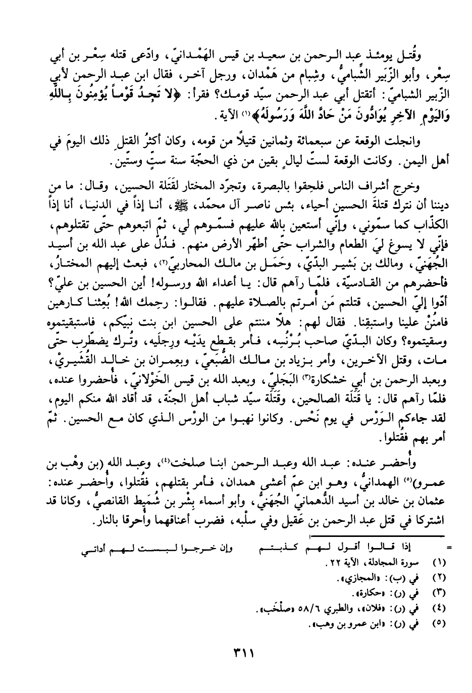 وَقُتِلَ يَوْمَئِذٍ عَبْدُ الرَّحْمَنِ بْنُ سَعِيدِ بْنِ قَيْسٍ الْهَمْدَانِيُّ، وَادَّعَى قَتْلَهُ سِعْرُ بْنُ أَبِي سِعْرٍ، وَأَبُو الزُّبَيْرِ الشِّبَامِيُّ، وَشِبَامٌ، مِنْ هَمْدَانَ، وَرَجُلٌ آخَرُ، فَقَالَ ابْنُ عَبْدِ الرَّحْمَنِ لِأَبِي الزُّبَيْرِ الشِّبَامِيِّ: أَتَقْتُلُ أَبِي عَبْدَ الرَّحْمَنِ سَيِّدَ قَوْمِكَ؟ فَقَرَأَ: {لَا تَجِدُ قَوْمًا يُؤْمِنُونَ بِاللَّهِ وَالْيَوْمِ الْآخِرِ يُوَادُّونَ مَنْ حَادَّ اللَّهَ وَرَسُولَهُ} [المجادلة: 22] الْآيَةَ.
