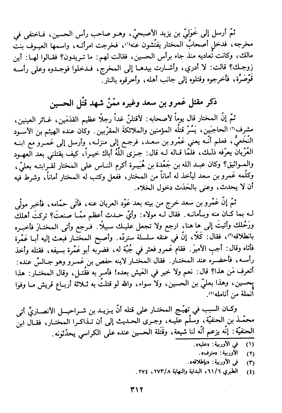 ثُمَّ إِنَّ عَمْرَو بْنَ سَعْدٍ خَرَجَ مِنْ بَيْتِهِ بَعْدَ عَوْدِ الْعُرْيَانِ عَنْهُ، فَأَتَى حَمَّامَهُ، فَأَخْبَرَ مَوْلًى لَهُ بِمَا كَانَ مِنْهُ وَبِأَمَانِهِ. فَقَالَ لَهُ مَوْلَاهُ: وَأَيُّ حَدَثٍ أَعْظَمُ مِمَّا صَنَعْتَ؟ تَرَكْتَ أَهْلَكَ وَرَحْلَكَ وَأَتَيْتَ إِلَى هَاهُنَا، ارْجِعْ وَلَا تَجْعَلْ عَلَيْكَ سَبِيلًا. فَرَجَعَ وَأَتَى الْمُخْتَارَ فَأَخْبَرَهُ بِانْطِلَاقِهِ، فَقَالَ: كَلَّا، إِنَّ فِي عُنُقِهِ سِلْسِلَةً سَتَرُدَّهُ. وَأَصْبَحَ الْمُخْتَارُ فَبَعَثَ إِلَيْهِ أَبَا عَمْرَةَ فَأَتَاهُ وَقَالَ: أَجِبِ الْأَمِيرَ. فَقَامَ عَمْرٌو فَعَثَرَ فِي جُبَّةٍ لَهُ، فَضَرَبَهُ أَبُو عَمْرَةَ بِسَيْفِهِ فَقَتَلَهُ، وَأَخَذَ رَأْسَهُ فَأَحْضَرَهُ عِنْدَ الْمُخْتَارِ. فَقَالَ الْمُخْتَارُ لِابْنِهِ حَفْصِ بْنِ عَمْرٍو وَهُوَ جَالِسٌ عِنْدَهُ: أَتَعْرِفُ مَنْ هَذَا. قَالَ: نَعَمْ، وَلَا خَيْرَ فِي الْعَيْشِ بَعْدَهُ! فَأَمَرَ بِهِ فَقُتِلَ، وَقَالَ الْمُخْتَارُ: هَذَا بِحُسَيْنٍ، وَهَذَا بِعَلِيِّ بْنِ الْحُسَيْنِ، وَلَا سَوَاءَ، وَاللَّهِ لَوْ قَتَلْتُ بِهِ ثَلَاثَةَ أَرْبَاعِ قُرَيْشٍ مَا وَفُّوا أُنْمُلَةً مِنْ أَنَامِلِهِ.