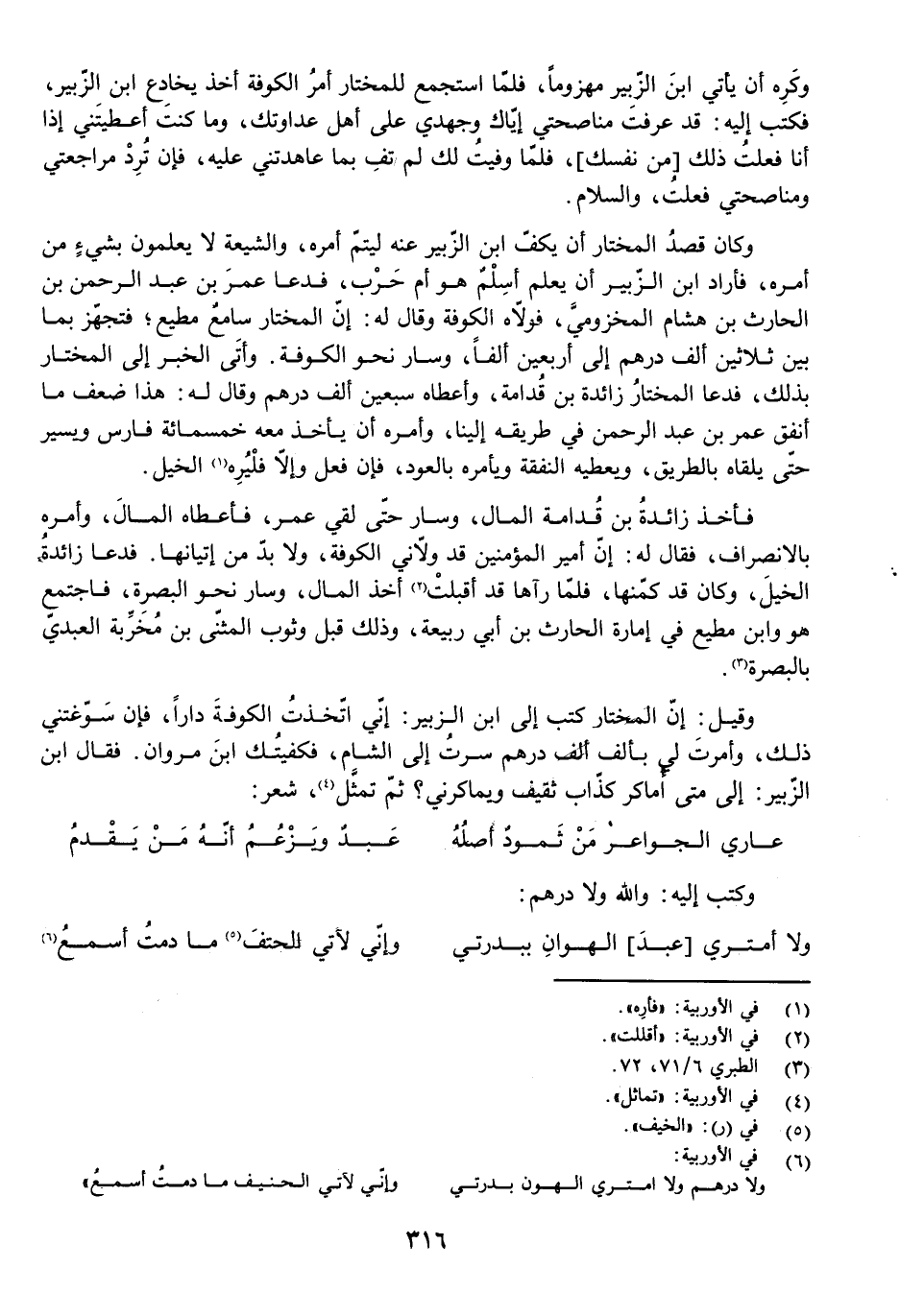 وَقِيلَ: إِنَّ الْمُخْتَارَ كَتَبَ إِلَى ابْنِ الزُّبَيْرِ: إِنِّي اتَّخَذْتُ الْكُوفَةَ دَارًا، فَإِنْ سَوَّغْتَنِي ذَلِكَ وَأَمَرْتَ لِي بِأَلْفِ أَلْفِ دِرْهَمٍ سِرْتُ إِلَى الشَّامِ، فَكَفَيْتُكَ ابْنَ مَرْوَانَ. فَقَالَ ابْنُ الزُّبَيْرِ: إِلَى مَتَى أُمَاكِرُ كَذَّابَ ثَقِيفٍ وَيُمَاكِرُنِي؟ ثُمَّ تَمَثَّلَ، شِعْرٌ: عَارِي الْجَوَاعِرِ مَنْ ثَمُودٌ أَصْلُهُ عَبْدٌ وَيَزْعُمُ أَنَّهُ مَنْ يَقْدُمُ