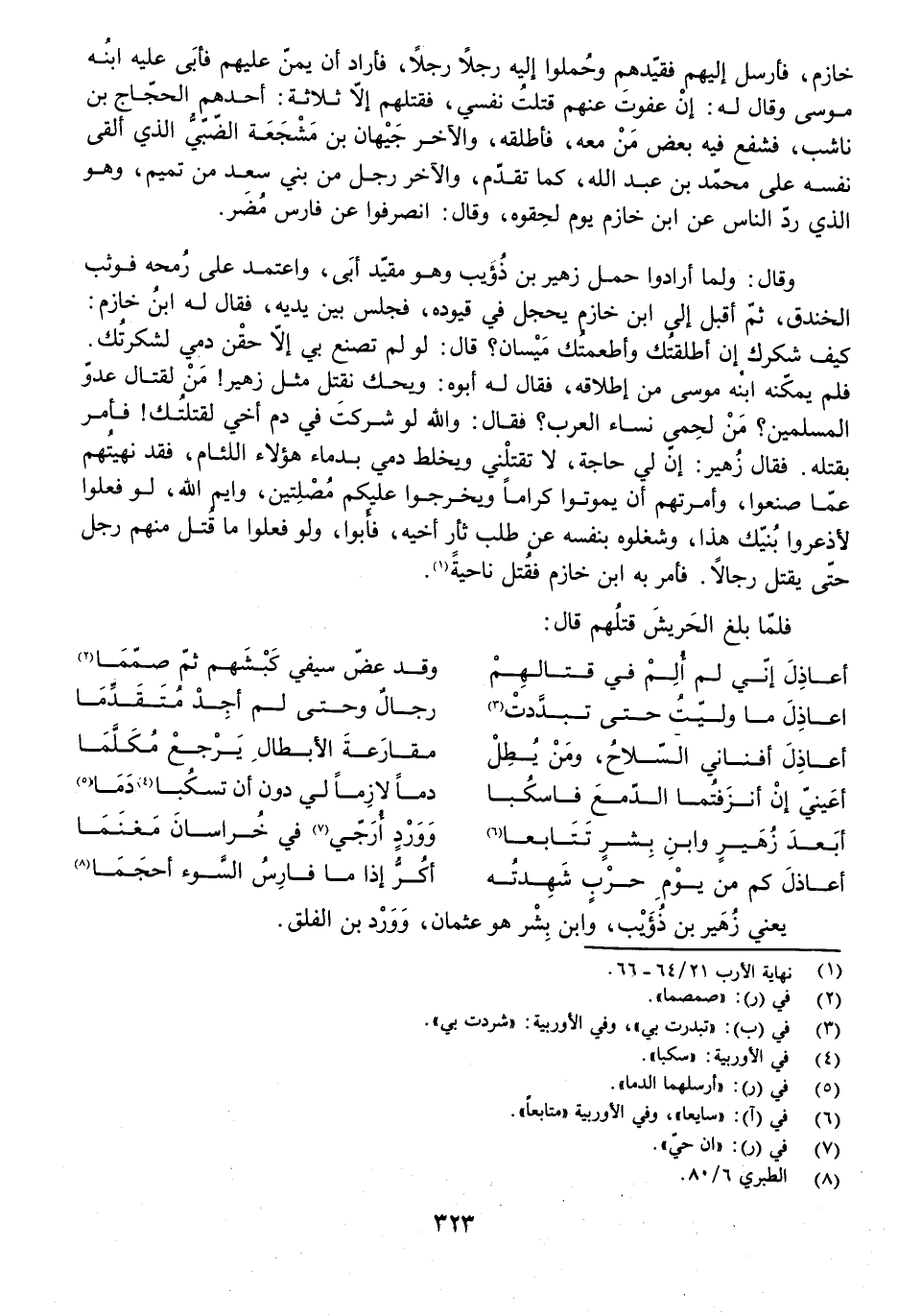 وَقَالَ: وَلَمَّا أَرَادُوا حَمْلَ زُهَيْرِ بْنِ ذُؤَيْبٍ وَهُوَ مُقَيَّدٌ أَبَى، وَاعْتَمَدَ عَلَى رُمْحِهِ فَوَثَبَ الْخَنْدَقَ، ثُمَّ أَقْبَلَ إِلَى ابْنِ خَازِمٍ يَحْجِلُ فِي قُيُودِهِ، فَجَلَسَ بَيْنَ يَدَيْهِ، فَقَالَ لَهُ ابْنُ خَازِمٍ: كَيْفَ شُكْرُكَ إِنْ أَطْلَقْتُكَ وَأَطْعَمْتُكَ مَيْسَانَ؟ قَالَ: لَوْ لَمْ تَصْنَعْ بِي إِلَّا حَقْنَ دَمِي لَشَكَرْتُكَ. فَلَمْ يُمَكِّنْهُ ابْنُهُ مُوسَى مِنْ إِطْلَاقِهِ، فَقَالَ لَهُ أَبُوهُ: وَيْحَكَ نَقْتُلُ مِثْلَ زُهَيْرٍ! مَنْ لِقِتَالِ عَدُوِّ الْمُسْلِمِينَ؟ مَنْ لِحِمَى نِسَاءِ الْعَرَبِ؟ فَقَالَ: وَاللَّهِ لَوْ شَرَكْتَ فِي دَمِ أَخِي لَقَتَلْتُكَ! فَأَمَرَ بِقَتْلِهِ. فَقَالَ زُهَيْرٌ: إِنَّ لِي حَاجَةً، لَا تَقْتُلْنِي وَيُخْلَطُ دَمِي بِدِمَاءِ هَؤُلَاءِ اللِّئَامِ، فَقَدْ نَهَيْتُهُمْ عَمَّا صَنَعُوا، وَأَمَرْتُهُمْ أَنْ يَمُوتُوا كِرَامًا وَيَخْرُجُوا عَلَيْكُمْ مُصْلِتِينَ، وَايْمُ اللَّهِ لَوْ فَعَلُوا لَأَذْعَرُوا بُنَيَّكَ هَذَا، وَشَغَلُوهُ بِنَفْسِهِ عَنْ طَلَبِ ثَأْرِ أَخِيهِ، فَأَبَوْا، وَلَوْ فَعَلُوا مَا قُتِلَ مِنْهُمْ رَجُلٌ حَتَّى يَقْتُلَ رِجَالًا. فَأَمَرَ بِهِ ابْنُ خَازِمٍ فَقُتِلَ نَاحِيَةً.