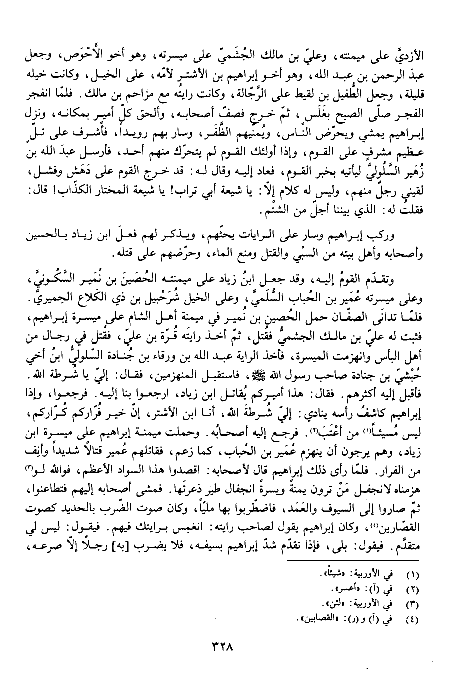 وَتَقَدَّمَ الْقَوْمُ إِلَيْهِ، وَقَدْ جَعَلَ ابْنُ زِيَادٍ عَلَى مَيْمَنَتِهِ الْحُصَيْنَ بْنَ نُمَيْرٍ السَّكُونِيَّ، وَعَلَى مَيْسَرَتِهِ عُمَيْرَ بْنَ الْحُبَابِ السُّلَمِيَّ، وَعَلَى الْخَيْلِ شُرَحْبِيلَ بْنَ ذِي الْكُلَاعِ الْحِمْيَرِيَّ. فَلَمَّا تَدَانَى الصَّفَّانِ حَمَلَ الْحُصَيْنُ بْنُ نُمَيْرٍ فِي مَيْمَنَةِ أَهْلِ الشَّامِ عَلَى مَيْسَرَةِ إِبْرَاهِيمَ، فَثَبَتَ لَهُ عَلِيُّ بْنُ مَالِكٍ الْجُشَمِيُّ فَقُتِلَ، ثُمَّ أَخَذَ رَايَتَهُ قُرَّةُ بْنُ عَلِيٍّ، فَقُتِلَ فِي رِجَالٍ مِنْ أَهْلِ الْبَأْسِ وَانْهَزَمَتِ الْمَيْسَرَةُ، فَأَخَذَ الرَّايَةَ عَبْدُ اللَّهِ بْنُ وَرْقَاءَ بْنِ جُنَادَةَ السَّلُولِيُّ ابْنُ أَخِي حُبْشِيِّ بْنِ جُنَادَةَ صَاحِبِ رَسُولِ اللَّهِ - صَلَّى اللَّهُ عَلَيْهِ وَسَلَّمَ - فَاسْتَقْبَلَ الْمُنْهَزِمِينَ، فَقَالَ: إِلَيَّ يَا شُرْطَةَ اللَّهِ. فَأَقْبَلَ إِلَيْهِ أَكْثَرُهُمْ. فَقَالَ: هَذَا أَمِيرُكُمْ يُقَاتِلُ ابْنَ زِيَادٍ، ارْجِعُوا بِنَا إِلَيْهِ فَرَجَعُوا، وَإِذَا إِبْرَاهِيمُ كَاشِفٌ رَأْسَهُ يُنَادِي: إِلَيَّ شُرْطَةَ اللَّهِ، أَنَا ابْنُ الْأَشْتَرِ، إِنَّ خَيْرَ فُرَّارِكُمْ كُرَّارُكُمْ، لَيْسَ مُسِيئًا مَنْ أَعْتَبَ. فَرَجَعَ إِلَيْهِ أَصْحَابُهُ، وَحَمَلَتْ مَيْمَنَةُ إِبْرَاهِيمَ عَلَى مَيْسَرَةِ ابْنِ زِيَادٍ وَهُمْ يَرْجُونَ أَنْ يَنْهَزِمَ عُمَيْرُ بْنُ الْحُبَابِ، كَمَا زَعَمَ، فَقَاتَلَهُمْ عُمَيْرٌ قِتَالًا شَدِيدًا وَأَنِفَ مِنَ الْفِرَارِ. فَلَمَّا رَأَى ذَلِكَ إِبْرَاهِيمُ قَالَ لِأَصْحَابِهِ: اقْصِدُوا هَذَا السَّوَادَ الْأَعْظَمَ، فَوَاللَّهِ لَوْ هَزَمْنَاهُ لَانْجَفَلَ مَنْ تَرَوْنَ يَمْنَةً وَيَسْرَةً انْجِفَالَ طَيْرٍ ذَعَرْتَهَا. فَمَشَى أَصْحَابُهُ إِلَيْهِمْ فَتَطَاعَنُوا، ثُمَّ صَارُوا إِلَى السُّيُوفِ وَالْعُمُدِ، فَاضْطَرَبُوا بِهَا مَلِيًّا، وَكَانَ صَوْتُ الضَّرْبِ بِالْحَدِيدِ كَصَوْتِ الْقَصَّارِينَ، وَكَانَ إِبْرَاهِيمُ يَقُولُ لِصَاحِبِ رَايَتِهِ: انْغَمِسْ بِرَايَتِكَ فِيهِمْ. فَيَقُولُ: لَيْسَ لِي مُتَقَدَّمٌ. فَيَقُولُ: بَلَى. فَإِذَا تَقَدَّمَ شَدَّ إِبْرَاهِيمُ بِسَيْفِهِ، فَلَا يَضْرِبُ [بِهِ] رَجُلًا إِلَّا صَرَعَهُ،