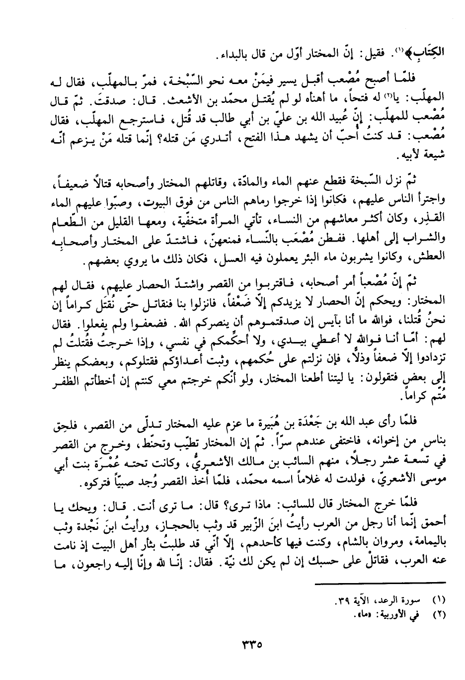 فَلَمَّا خَرَجَ الْمُخْتَارُ قَالَ لِلسَّائِبِ: مَاذَا تَرَى؟ قَالَ: مَا تَرَى أَنْتَ. قَالَ: وَيْحَكَ يَا أَحْمَقُ، إِنَّمَا أَنَا رَجُلٌ مِنَ الْعَرَبِ رَأَيْتُ ابْنَ الزُّبَيْرِ قَدْ وَثَبَ بِالْحِجَازِ، وَرَأَيْتُ ابْنَ نَجْدَةَ وَثَبَ بِالْيَمَامَةِ، وَمَرْوَانُ بِالشَّامِ، وَكُنْتُ فِيهَا كَأَحَدِهِمْ، إِلَّا أَنِّي قَدْ طَلَبْتُ بِثَأْرِ أَهْلِ الْبَيْتِ إِذْ نَامَتْ عَنْهُ الْعَرَبُ، فَقَاتِلْ عَلَى حَسْبِكَ إِنْ لَمْ يَكُنْ لَكَ نِيَّةٌ. فَقَالَ: إِنَّا لِلَّهِ وَإِنَّا إِلَيْهِ رَاجِعُونَ، مَا