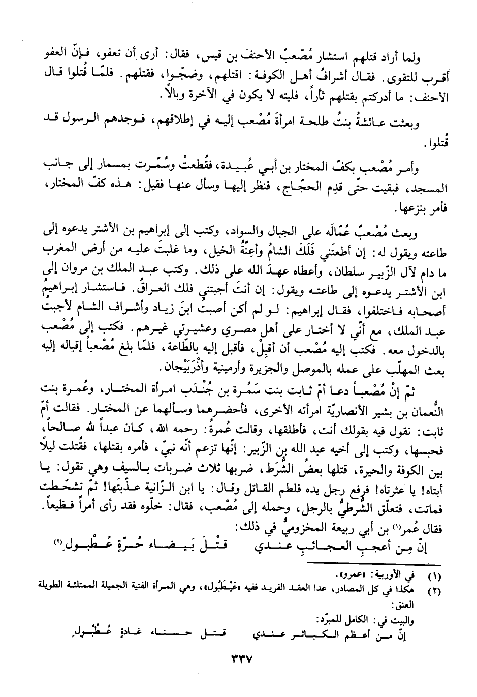 ثُمَّ إِنَّ مُصْعَبًا دَعَا أُمَّ ثَابِتٍ بِنْتَ سَمُرَةَ بْنِ جُنْدُبٍ امْرَأَةَ الْمُخْتَارِ، وَعَمْرَةَ بِنْتَ النُّعْمَانِ بْنِ بَشِيرٍ الْأَنْصَارِيَّةَ امْرَأَتَهُ الْأُخْرَى، فَأَحْضَرَهُمَا وَسَأَلَهُمَا عَنِ الْمُخْتَارِ. فَقَالَتْ أُمُّ ثَابِتٍ: نَقُولُ فِيهِ بِقَوْلِكَ أَنْتَ. فَأَطْلَقَهَا، وَقَالَتْ عَمْرَةُ: رَحِمَهُ اللَّهُ، كَانَ عَبْدًا لِلَّهِ صَالِحًا. فَحَبَسَهَا، وَكَتَبَ إِلَى أَخِيهِ عَبْدِ اللَّهِ بْنِ الزُّبَيْرِ: إِنَّهَا تَزْعُمُ أَنَّهُ نَبِيٌّ، فَأَمَرَهُ بِقَتْلِهَا، فَقُتِلَتْ لَيْلًا بَيْنَ الْكُوفَةِ وَالْحِيرَةِ، قَتَلَهَا بَعْضُ الشُّرَطِ، ضَرَبَهَا ثَلَاثَ ضَرَبَاتٍ بِالسَّيْفِ وَهِيَ تَقُولُ: يَا أَبَتَاهُ! يَا عَثْرَتَاهُ! فَرَفَعَ رَجُلٌ يَدَهُ فَلَطَمَ الْقَاتِلَ وَقَالَ: يَا ابْنَ الزَّانِيَةِ، عَذَّبْتَهَا! ثُمَّ تَشَحَّطَتْ فَمَاتَتْ، فَتَعَلَّقَ الشُّرْطِيُّ بِالرَّجُلِ وَحَمَلَهُ إِلَى مُصْعَبٍ، فَقَالَ: خَلُّوهُ فَقَدْ رَأَى أَمْرًا فَظِيعًا. فَقَالَ عُمَرُ بْنُ أَبِي رَبِيعَةَ الْمَخْزُومِيُّ فِي ذَلِكَ: