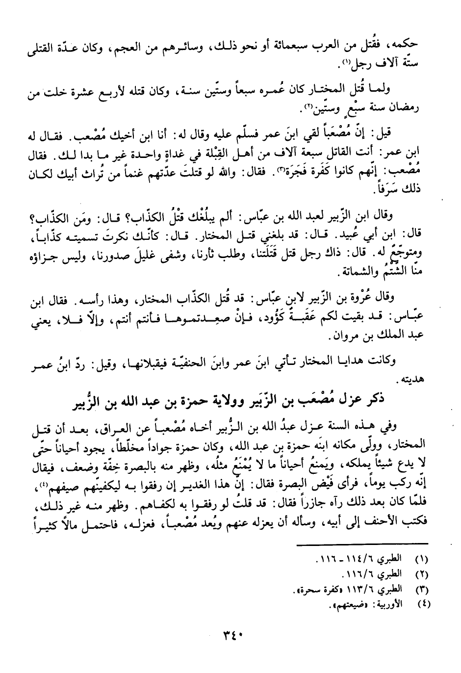 وَقَالَ ابْنُ الزُّبَيْرِ لِعَبْدِ اللَّهِ بْنِ عَبَّاسٍ: أَلَمْ يَبْلُغْكَ قَتْلُ الْكَذَّابِ؟ قَالَ: وَمَنِ الْكَذَّابُ؟ قَالَ: ابْنُ أَبِي عُبَيْدٍ. قَالَ: قَدْ بَلَغَنِي قَتْلُ الْمُخْتَارِ. قَالَ: كَأَنَّكَ نَكَرْتَ تَسْمِيَتَهُ كَذَّابًا، وَمُتَوَجِّعٌ لَهُ. قَالَ: ذَاكَ رَجُلٌ قَتَلَ قَتَلَتَنَا، وَطَلَبَ ثَأْرَنَا، وَشَفَى غَلِيلَ صُدُورِنَا، وَلَيْسَ جَزَاؤُهُ مِنَّا الشَّتْمَ وَالشَّمَاتَةَ.