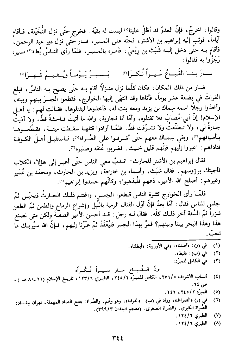 فَقَالَ إِبْرَاهِيمُ بْنُ الْأَشْتَرِ لِلْحَارِثِ: انْدُبْ مَعِيَ النَّاسَ حَتَّى أَعْبُرَ إِلَى هَؤُلَاءِ الْكِلَابِ فَأَجِيئَكَ بِرُءُوسِهِمْ. فَقَالَ شَبَثٌ، وَأَسْمَاءُ بْنُ خَارِجَةَ، وَيَزِيدُ بْنُ الْحَارِثِ، وَمُحَمَّدُ بْنُ عُمَيْرٍ وَغَيْرُهُمْ: أَصْلَحَ اللَّهُ الْأَمِيرَ، دَعْهُمْ فَلْيَذْهَبُوا. وَكَأَنَّهُمْ حَسَدُوا إِبْرَاهِيمَ.