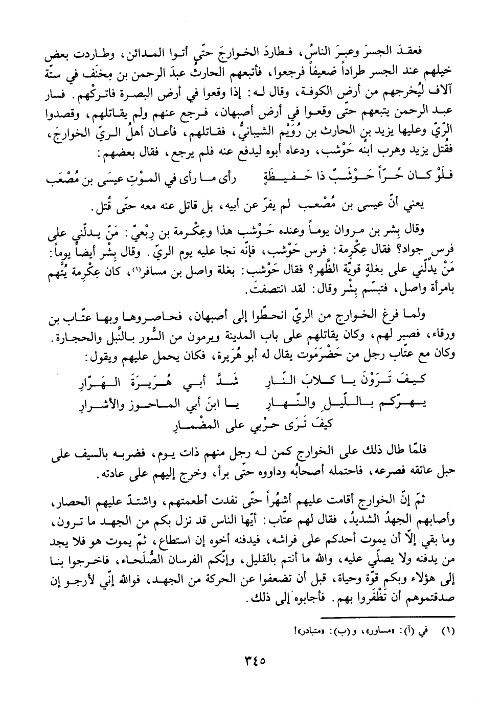 ثُمَّ إِنَّ الْخَوَارِجَ أَقَامَتْ عَلَيْهِمْ أَشْهُرًا حَتَّى نَفِدَتْ أَطْعِمَتُهُمْ، وَاشْتَدَّ عَلَيْهِمُ الْحِصَارُ، وَأَصَابَهُمُ الْجُهْدُ الشَّدِيدُ، فَقَالَ لَهُمْ عَتَّابٌ: أَيُّهَا النَّاسُ قَدْ نَزَلَ بِكُمْ مِنَ الْجُهْدِ مَا تَرَوْنَ، وَمَا بَقِيَ إِلَّا أَنْ يَمُوتَ أَحَدُكُمْ عَلَى فِرَاشِهِ، فَيَدْفِنَهُ أَخُوهُ إِنِ اسْتَطَاعَ، ثُمَّ يَمُوتُ هُوَ فَلَا يَجِدُ مَنْ يَدْفِنُهُ وَلَا يُصَلِّي عَلَيْهِ، وَاللَّهِ مَا أَنْتُمْ بِالْقَلِيلِ، وَإِنَّكُمُ الْفُرْسَانُ الصُّلَحَاءُ، فَاخْرُجُوا بِنَا إِلَى هَؤُلَاءِ وَبِكُمْ قُوَّةٌ وَحَيَاةٌ، قَبْلَ أَنْ تَضْعُفُوا عَنِ الْحَرَكَةِ مِنَ الْجُهْدِ، فَوَاللَّهِ إِنِّي لَأَرْجُو إِنْ صَدَقْتُمُوهُمْ أَنْ تَظْفَرُوا بِهِمْ. فَأَجَابُوهُ إِلَى ذَلِكَ.