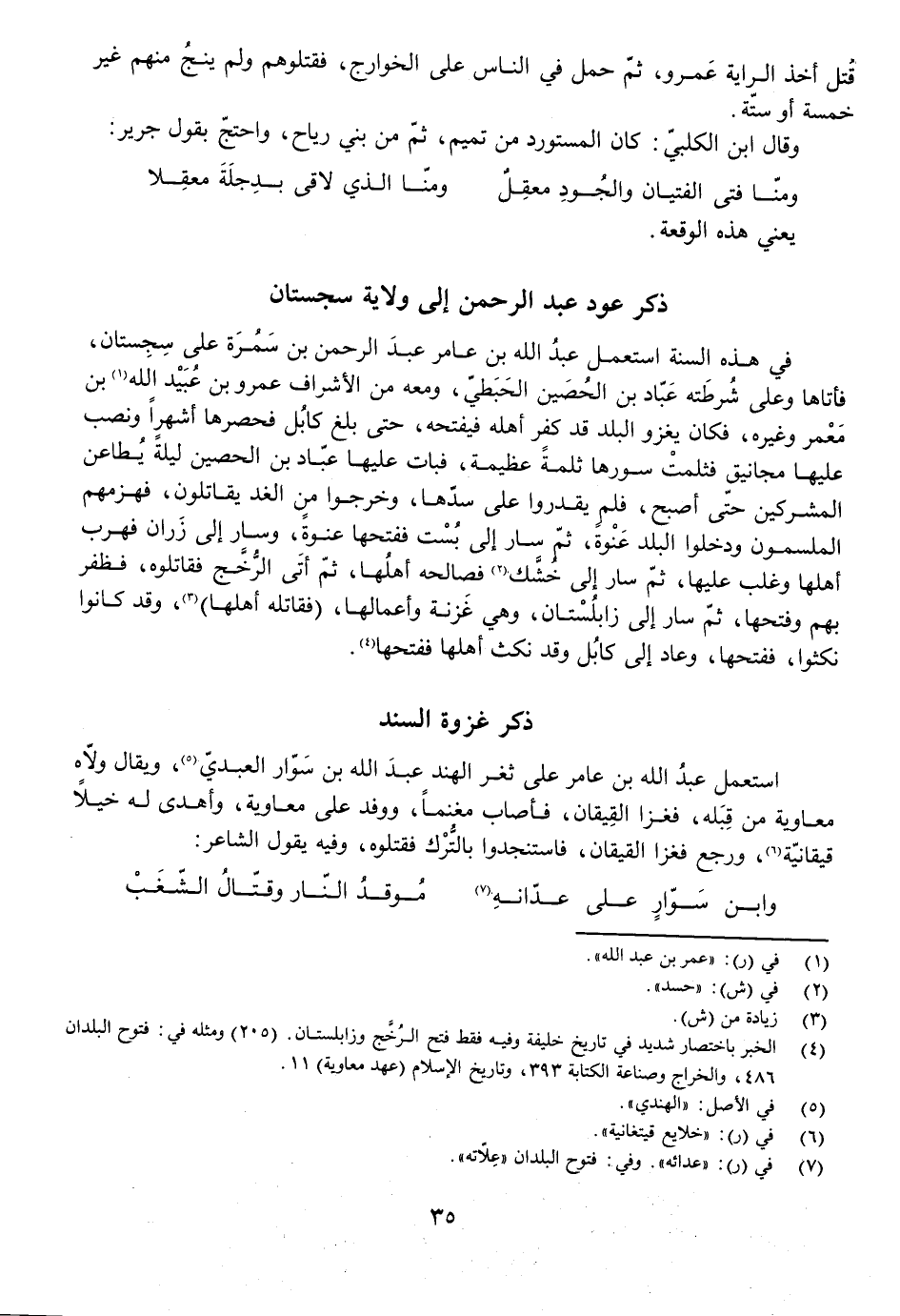 فِي هَذِهِ السَّنَةِ اسْتَعْمَلَ عَبْدُ اللَّهِ بْنُ عَامِرٍ عَبْدَ الرَّحْمَنِ بْنَ سَمُرَةَ عَلَى سِجِسْتَانَ، فَأَتَاهَا وَعَلَى شُرْطَتِهِ عَبَّادُ بْنُ الْحُصَيْنِ الْحَبَطِيُّ وَمَعَهُ مِنَ الْأَشْرَافِ عَمْرُو بْنُ عُبَيْدِ اللَّهِ بْنِ مَعْمَرٍ وَغَيْرُهُ، فَكَانَ يَغْزُو الْبَلَدَ قَدْ كَفَرَ أَهْلُهُ فَيَفْتَحُهُ، حَتَّى بَلَغَ كَابُلَ فَحَصَرَهَا أَشْهُرًا وَنَصَبَ عَلَيْهَا مَجَانِيقَ فَثَلَمَتْ سُورَهَا ثُلْمَةً عَظِيمَةً، فَبَاتَ عَلَيْهَا عَبَّادُ بْنُ الْحُصَيْنِ لَيْلَةً يُطَاعِنُ الْمُشْرِكِينَ حَتَّى أَصْبَحَ فَلَمْ يَقْدِرُوا عَلَى سَدِّهَا وَخَرَجُوا مِنَ الْغَدِ يُقَاتِلُونَ فَهَزَمَهُمُ الْمُسْلِمُونَ وَدَخَلُوا الْبَلَدَ عَنْوَةً، ثُمَّ سَارَ إِلَى بُسْتَ فَفَتَحَهَا عَنْوَةً، وَسَارَ إِلَى زَرَانَ فَهَرَبَ أَهْلُهَا وَغَلَبَ عَلَيْهَا، ثُمَّ سَارَ إِلَى خُشَّكَ فَصَالَحَهُ أَهْلُهَا، ثُمَّ أَتَى الرُّخَّجَ فَقَاتَلُوهُ، فَظَفِرَ بِهِمْ وَفَتَحَهَا، ثُمَّ سَارَ إِلَى زَابُلُسْتَانَ، وَهِيَ غَزْنَةُ وَأَعْمَالُهَا، (فَقَاتَلَهُ أَهْلُهَا) ، وَقَدْ كَانُوا نَكَثُوا، فَفَتَحَهَا، وَعَادَ إِلَى كَابُلَ وَقَدْ نَكَثَ أَهْلُهَا فَفَتَحَهَا.