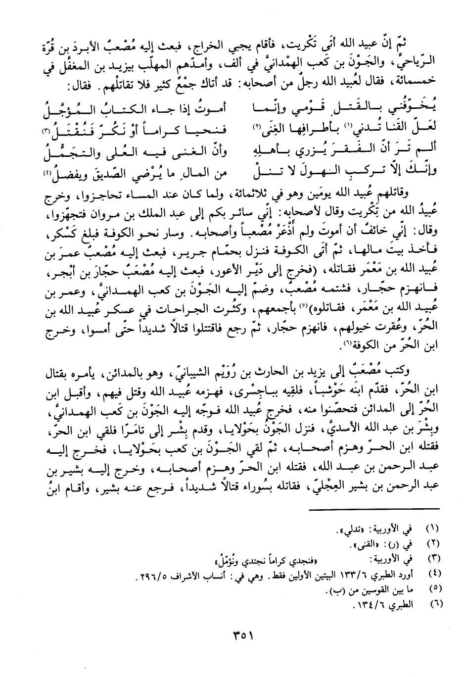 ثُمَّ إِنَّ عُبَيْدَ اللَّهِ أَتَى تَكْرِيتَ، فَأَقَامَ يَجْبِي الْخَرَاجَ، فَبَعَثَ إِلَيْهِ مُصْعَبٌ الْأَبْرَدَ بْنَ قُرَّةَ الرِّيَاحِيَّ، وَالْجَوْنَ بْنَ كَعْبٍ الْهَمْدَانِيَّ، فِي أَلْفٍ، وَأَمَدَّهُمُ الْمُهَلَّبُ بِيَزِيدَ بْنِ الْمُغَفَّلِ فِي خَمْسِمِائَةٍ، فَقَالَ لِعُبَيْدِ اللَّهِ رَجُلٌ مِنْ أَصْحَابِهِ: قَدْ أَتَاكَ جَمْعٌ كَثِيرٌ فَلَا تُقَاتِلْهُمْ. فَقَالَ:
