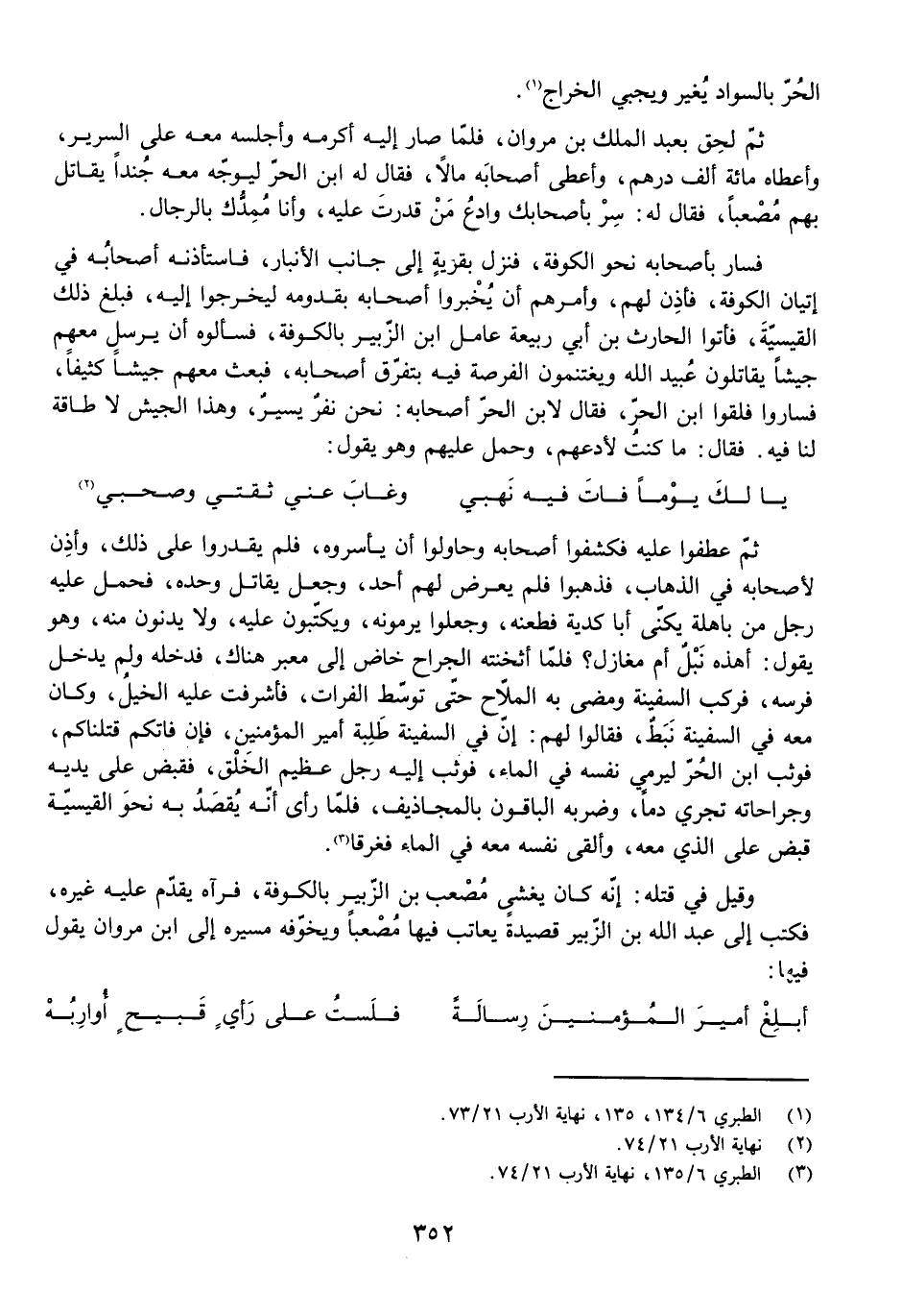 ثُمَّ لَحِقَ بِعَبْدِ الْمَلِكِ بْنِ مَرْوَانَ، فَلَمَّا صَارَ إِلَيْهِ أَكْرَمَهُ وَأَجْلَسَهُ مَعَهُ عَلَى السَّرِيرِ، وَأَعْطَاهُ مِائَةَ أَلْفِ دِرْهَمٍ، وَأَعْطَى أَصْحَابَهُ مَالًا، فَقَالَ لَهُ ابْنُ الْحُرِّ لِيُوَجِّهَ مَعَهُ جُنْدًا يُقَاتِلُ بِهِمْ مُصْعَبًا، فَقَالَ لَهُ: سِرْ بِأَصْحَابِكَ، وَادْعُ مَنْ قَدَرْتَ عَلَيْهِ، وَأَنَا مُمِدُّكَ بِالرِّجَالِ.