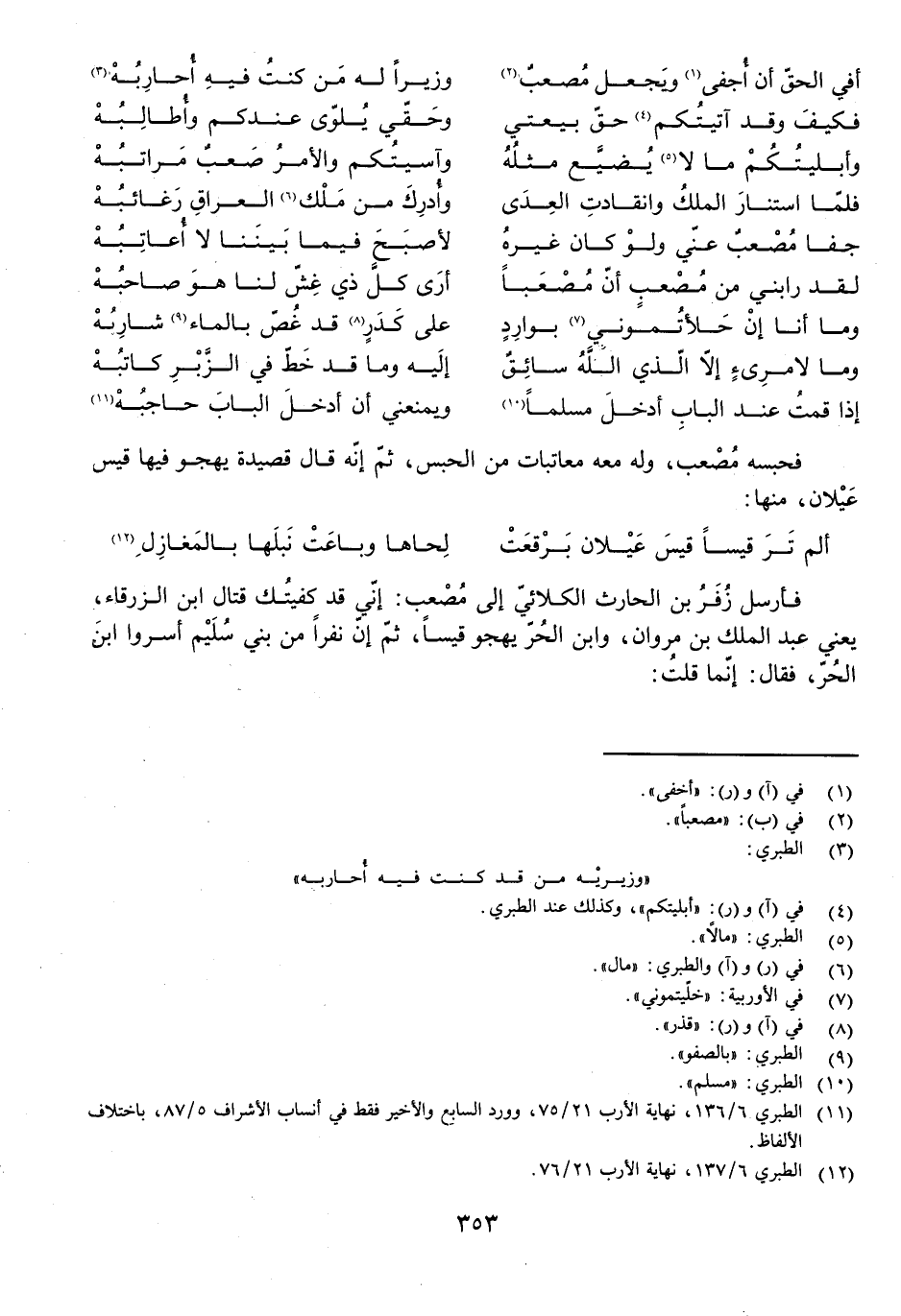 فَحَبَسَهُ مُصْعَبٌ، وَلَهُ مَعَهُ مُعَاتَبَاتٌ مِنَ الْحَبْسِ، ثُمَّ إِنَّهُ قَالَ قَصِيدَةً يَهْجُو فِيهَا قَيْسَ عَيْلَانَ، مِنْهَا: