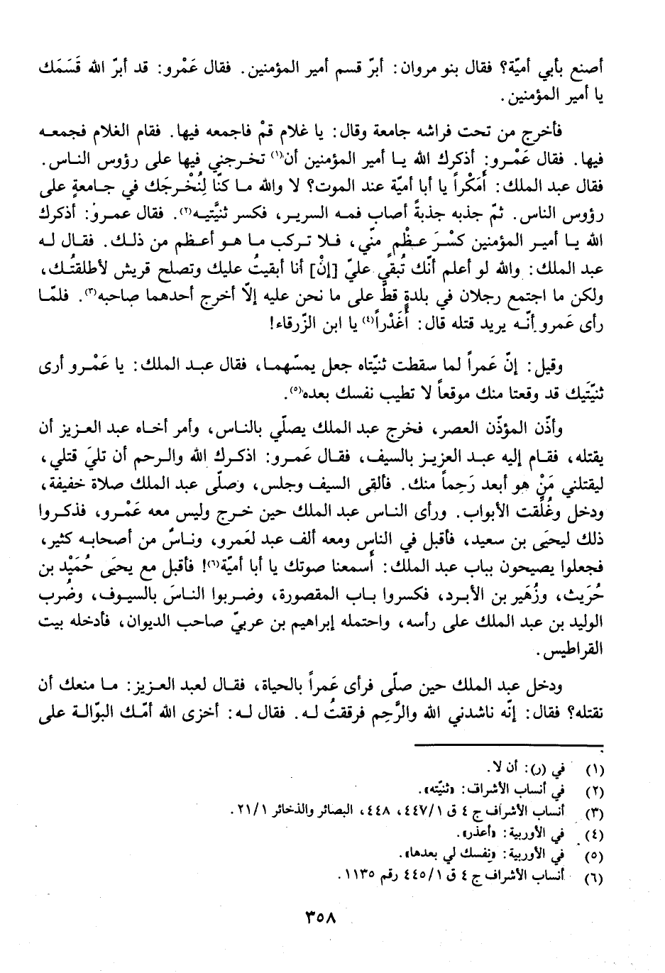 فَأَخْرَجَ مِنْ تَحْتِ فِرَاشِهِ جَامِعَةً وَقَالَ: يَا غُلَامُ، قُمْ فَاجْمَعْهُ فِيهَا. فَقَامَ الْغُلَامُ فَجَمَعَهُ فِيهَا. فَقَالَ عَمْرٌو: أُذَكِّرُكَ اللَّهَ يَا أَمِيرَ الْمُؤْمِنِينَ أَنْ تُخْرِجَنِي فِيهَا عَلَى رُءُوسِ النَّاسِ. فَقَالَ عَبْدُ الْمَلِكِ: أَمَكْرًا يَا أَبَا أُمَيَّةَ عِنْدَ الْمَوْتِ؟ لَا وَاللَّهِ مَا كُنَّا لِنُخْرِجَكَ فِي جَامِعَةٍ عَلَى رُءُوسِ النَّاسِ. ثُمَّ جَذَبَهُ جَذْبَةً أَصَابَ فَمَهُ السَّرِيرُ فَكَسَرَ ثَنِيَّتَيْهِ. فَقَالَ عَمْرٌو: أُذَكِّرُكَ اللَّهَ يَا أَمِيرَ الْمُؤْمِنِينَ، كُسِرَ عَظْمٌ مِنِّي فَلَا تَرْكَبْ مَا هُوَ أَعْظَمُ مِنْ ذَلِكَ. فَقَالَ لَهُ عَبْدُ الْمَلِكِ: وَاللَّهِ لَوْ أَعْلَمُ أَنَّكَ تُبْقِي عَلَيَّ إِنْ أَنَا أَبْقَيْتُ عَلَيْكَ وَتَصْلُحُ قُرَيْشٌ لَأَطْلَقْتُكَ، وَلَكِنْ مَا اجْتَمَعَ رَجُلَانِ فِي بَلَدِهِ قَطُّ عَلَى مَا نَحْنُ عَلَيْهِ إِلَّا أَخْرَجَ أَحَدُهُمَا صَاحِبَهُ. فَلَمَّا رَأَى عَمْرٌو أَنَّهُ يُرِيدُ قَتْلَهُ قَالَ: أَغَدْرًا يَا ابْنَ الزَّرْقَاءِ!