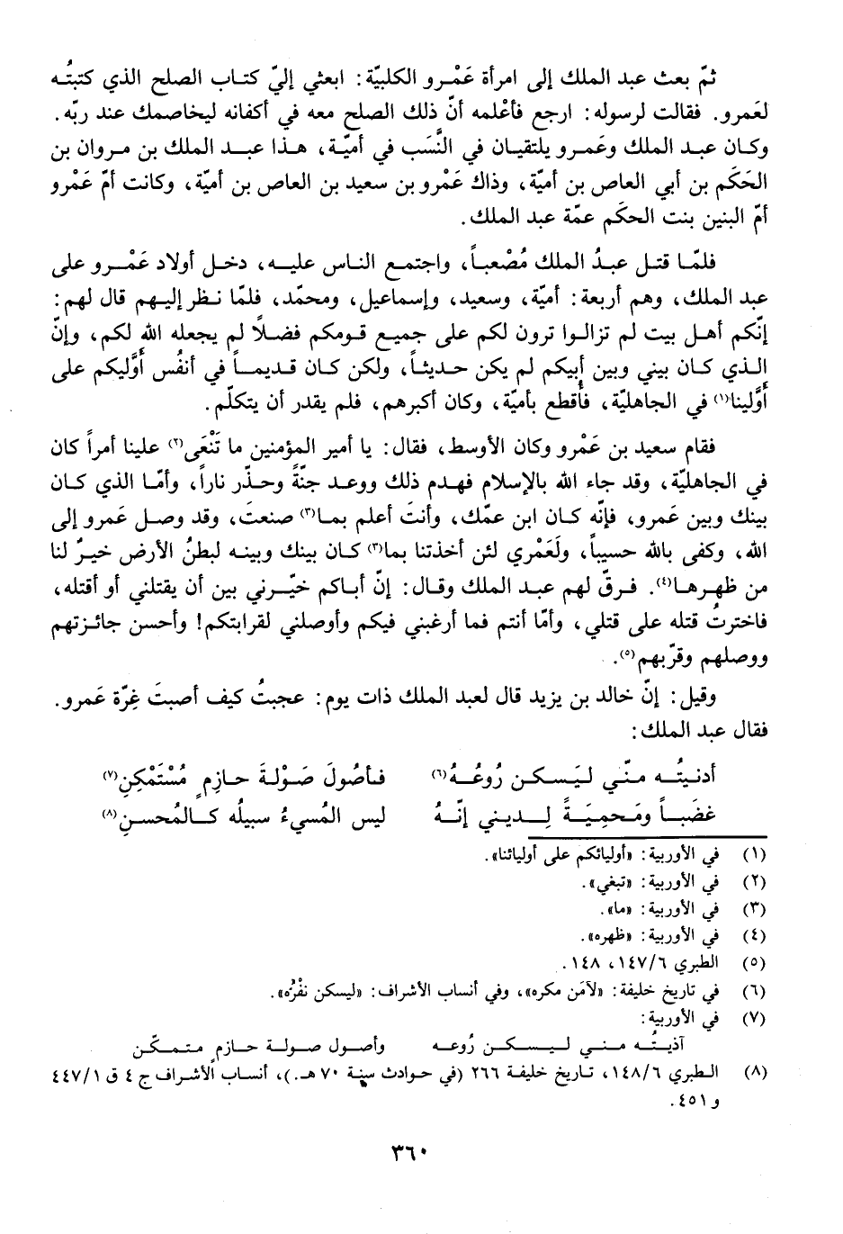 ثُمَّ بَعَثَ عَبْدُ الْمَلِكِ إِلَى امْرَأَةِ عَمْرٍو الْكَلْبِيَّةِ: ابْعَثِي إِلَيَّ كِتَابَ الصُّلْحِ الَّذِي كَتَبْتُهُ لِعَمْرٍو. فَقَالَتْ لِرَسُولِهِ: ارْجِعْ فَأَعْلِمْهُ أَنَّ ذَلِكَ الصُّلْحَ مَعَهُ فِي أَكْفَانِهِ لِيُخَاصِمَكَ عِنْدَ رَبِّهِ.