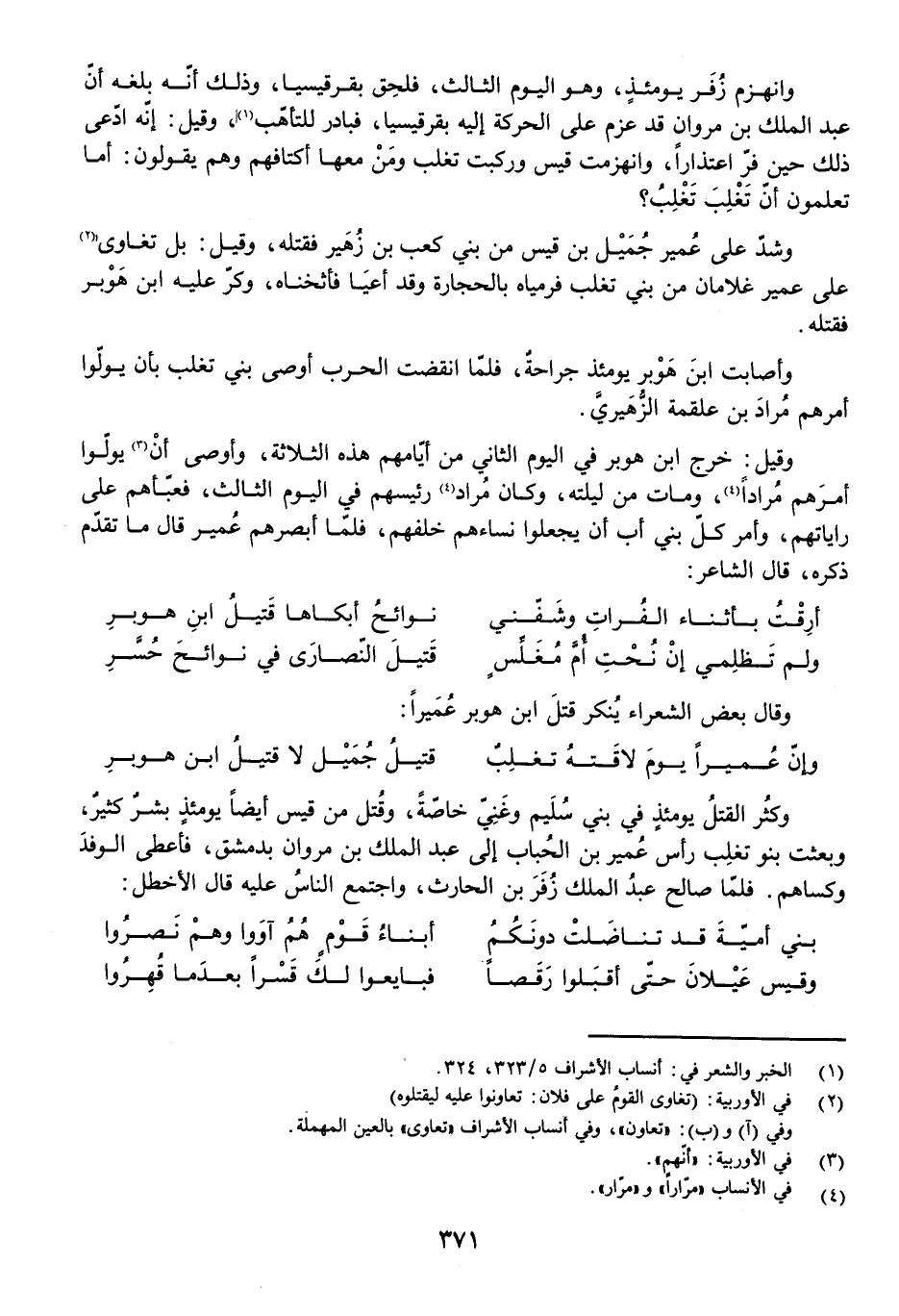 وَكَثُرَ الْقَتْلُ يَوْمَئِذٍ فِي بَنِي سُلَيْمٍ وَغَنِيٍّ خَاصَّةً، وَقُتِلَ مِنْ قَيْسٍ أَيْضًا يَوْمَئِذٍ بَشَرٌ كَثِيرٌ، وَبَعَثَتْ بَنُو تَغْلِبَ رَأْسَ عُمَيْرِ بْنِ الْحُبَابِ إِلَى عَبْدِ الْمَلِكِ بْنِ مَرْوَانَ بِدِمَشْقَ، فَأَعْطَى الْوَفْدَ وَكَسَاهُمْ. فَلَمَّا صَالَحَ عَبْدُ الْمَلِكِ زُفَرَ بْنَ الْحَارِثِ، وَاجْتَمَعَ النَّاسُ عَلَيْهِ قَالَ الْأَخْطَلُ