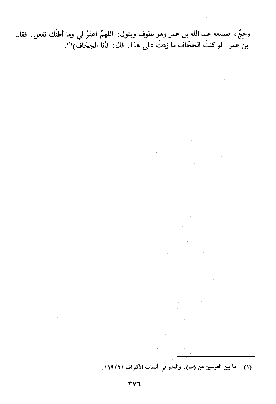 وَحَجَّ، فَسَمِعَهُ عَبْدُ اللَّهِ بْنُ عُمَرَ وَهُوَ يَطُوفُ وَيَقُولُ: اللَّهُمَّ اغْفِرْ لِي، وَمَا أَظُنُّكَ تَفْعَلُ؟ فَقَالَ ابْنُ عُمَرَ: لَوْ كُنْتَ الْجَحَّافَ مَا زِدْتَ عَلَى هَذَا. قَالَ: فَأَنَا الْجَحَّافُ) .