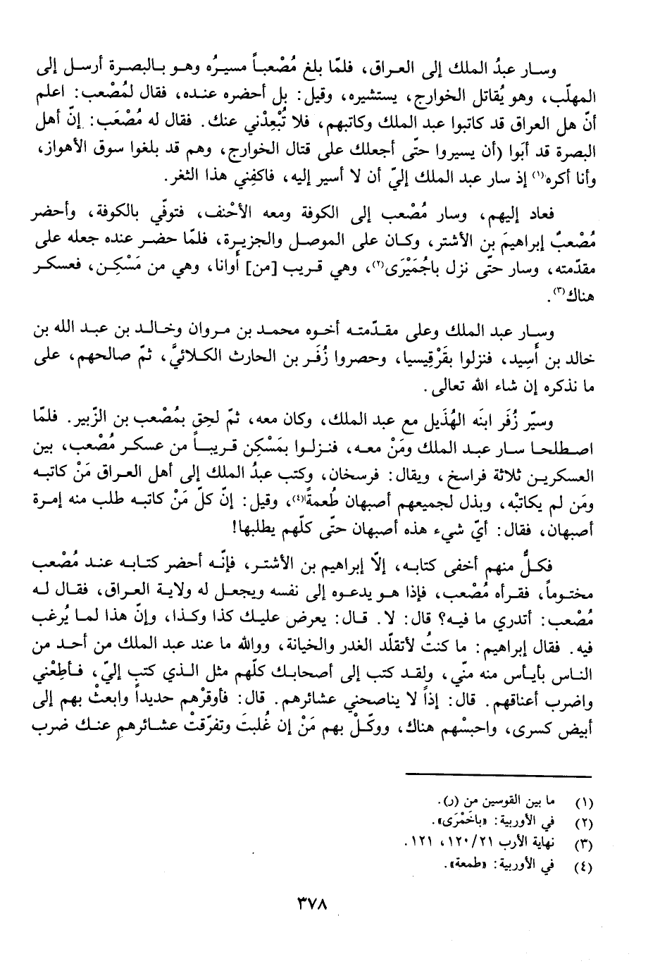 فَكُلٌّ مِنْهُمْ أَخْفَى كِتَابَهُ، إِلَّا إِبْرَاهِيمَ بْنَ الْأَشْتَرِ، فَإِنَّهُ أَحْضَرَ كِتَابَهُ عِنْدَ مُصْعَبٍ مَخْتُومًا، فَقَرَأَهُ مُصْعَبٌ، فَإِذَا هُوَ يَدْعُوهُ إِلَى نَفْسِهِ وَيَجْعَلُ لَهُ وِلَايَةَ الْعِرَاقِ، فَقَالَ لَهُ مُصْعَبٌ: أَتَدْرِي مَا فِيهِ. قَالَ: لَا. قَالَ: يَعْرِضُ عَلَيْكَ كَذَا وَكَذَا، وَإِنَّ هَذَا لَمَا يُرْغَبُ فِيهِ. فَقَالَ إِبْرَاهِيمُ: مَا كُنْتُ لِأَتَقَلَّدَ الْغَدْرَ وَالْخِيَانَةَ، وَوَاللَّهِ مَا عِنْدَ عَبْدِ الْمَلِكِ مِنْ أَحَدٍ مِنَ النَّاسِ بِأَيْأَسَ مِنْهُ مِنِّي، وَلَقَدْ كَتَبَ إِلَى أَصْحَابِكَ كُلِّهِمْ مِثْلَ الَّذِي كَتَبَ إِلَيَّ، فَأَطِعْنِي وَاضْرِبْ أَعْنَاقَهُمْ. قَالَ: إِذًا لَا يُنَاصِحُنِي عَشَائِرُهُمْ. قَالَ: فَأَوْقِرْهُمْ حَدِيدًا وَابْعَثْ بِهِمْ إِلَى أَبْيَضِ كِسْرَى، وَاحْبِسْهُمْ هُنَاكَ، وَوَكِّلْ بِهِمْ مَنْ إِنْ غُلِبْتَ وَتَفَرَّقَتْ عَشَائِرُهُمْ عَنْكَ ضَرَبَ