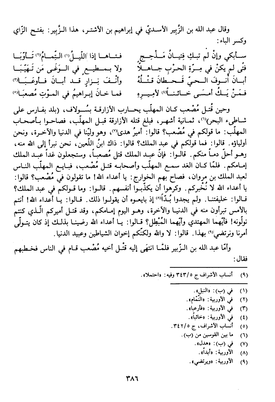 أَبَانَ أُنُوفَ الْحَيِّ قَحْطَانَ قَتْلُهُ وَأَنْفَ نِزَارٍ قَدْ أَبَانَ فَأَوْعَبَا ... فَمَنْ يَكُ أَمْسَى خَائِنًا لِأَمِيرِهِ فَمَا خَانَ إِبْرَاهِيمُ فِي الْمَوْتِ مُصْعَبَا