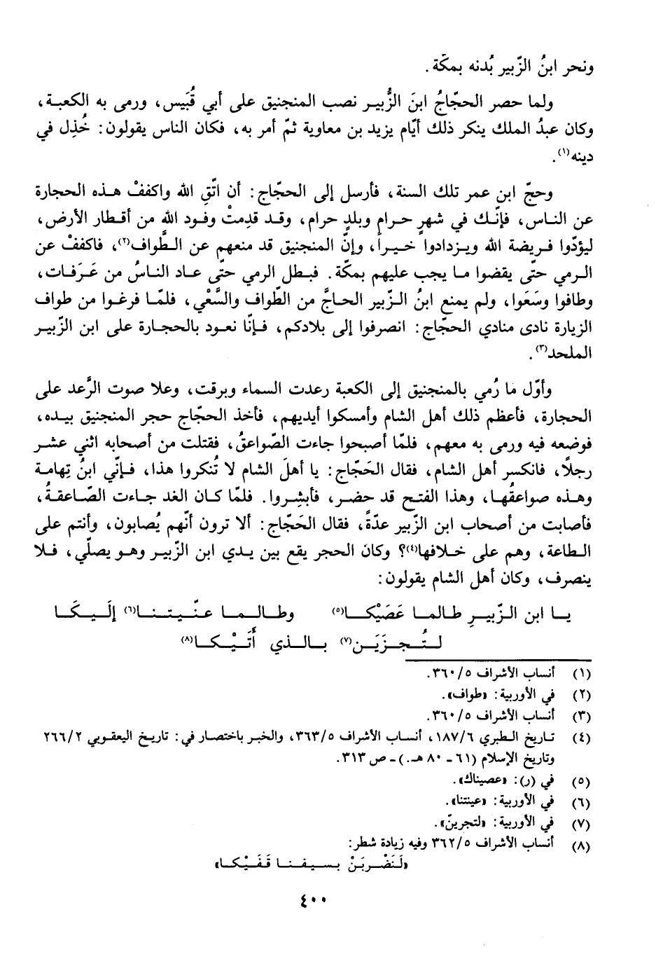 وَحَجَّ ابْنُ عُمَرَ تِلْكَ السَّنَةَ، فَأَرْسَلَ إِلَى الْحَجَّاجِ: أَنِ اتَّقِ اللَّهَ، وَاكْفُفْ هَذِهِ الْحِجَارَةَ عَنِ النَّاسِ، فَإِنَّكَ فِي شَهْرٍ حَرَامٍ وَبَلَدٍ حَرَامٍ، وَقَدْ قَدِمَتْ وُفُودُ اللَّهِ مِنْ أَقْطَارِ الْأَرْضِ لِيُؤَدُّوا فَرِيضَةَ اللَّهِ وَيَزْدَادُوا خَيْرًا، وَإِنَّ الْمَنْجَنِيقَ قَدْ مَنَعَهُمْ عَنِ الطَّوَافِ، فَاكْفُفْ عَنِ الرَّمْيِ حَتَّى يَقْضُوا مَا يَجِبُ عَلَيْهِمْ بِمَكَّةَ. فَبَطَّلَ الرَّمْيَ حَتَّى عَادَ النَّاسُ مِنْ عَرَفَاتٍ وَطَافُوا وَسَعَوْا، وَلَمْ يَمْنَعِ ابْنُ الزُّبَيْرِ الْحَاجَّ مِنَ الطَّوَافِ وَالسَّعْيِ، فَلَمَّا فَرَغُوا مِنْ طَوَافِ الزِّيَارَةِ نَادَى مُنَادِي الْحَجَّاجِ: انْصَرِفُوا إِلَى بِلَادِكُمْ، فَإِنَّا نَعُودُ بِالْحِجَارَةِ عَلَى ابْنِ الزُّبَيْرِ الْمُلْحِدِ.