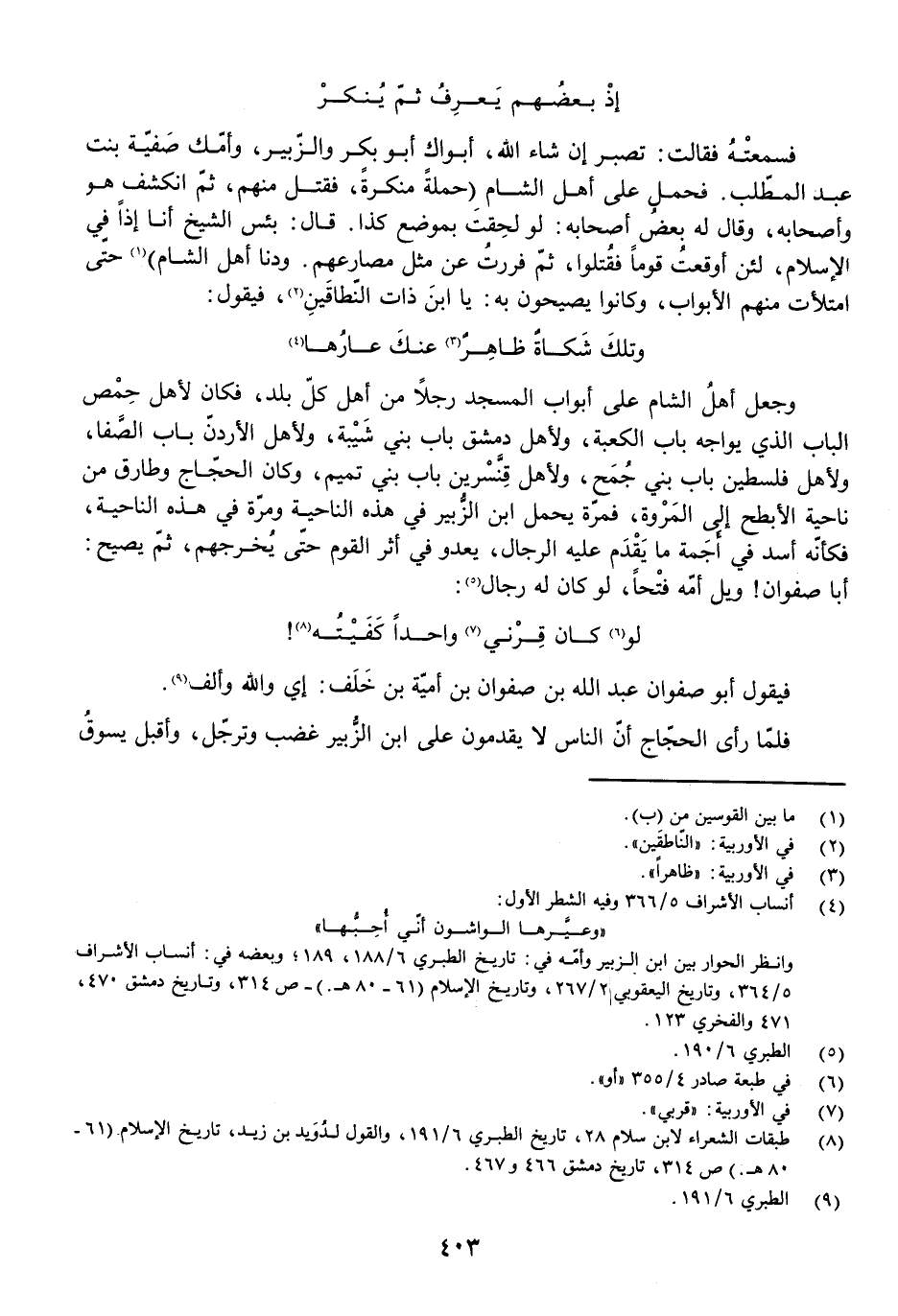وَجَعَلَ أَهْلُ الشَّامِ عَلَى أَبْوَابِ الْمَسْجِدِ رَجُلًا مِنْ أَهْلِ كُلِّ بَلَدٍ، فَكَانَ لِأَهْلِ حِمْصٍ الْبَابُ الَّذِي يُوَاجِهُ بَابَ الْكَعْبَةِ، وَلِأَهْلِ دِمَشْقَ بَابُ بَنِي شَيْبَةَ، وَلِأَهْلِ الْأُرْدُنِّ بَابُ الصَّفَا، وَلِأَهْلِ فَلَسْطِينَ بَابُ بَنِي جُمَحٍ، وَلِأَهْلِ قِنَّسْرِينَ بَابُ بَنِي تَمِيمٍ، وَكَانَ الْحَجَّاجُ وَطَارِقٌ مِنْ نَاحِيَةِ الْأَبْطَحِ إِلَى الْمَرْوَةِ، فَمَرَّةً يَحْمِلُ ابْنُ الزُّبَيْرِ فِي هَذِهِ النَّاحِيَةِ وَمَرَّةً فِي هَذِهِ النَّاحِيَةِ، فَكَأَنَّهُ أَسَدٌ فِي أَجَمَةٍ مَا يَقْدَمُ عَلَيْهِ الرِّجَالُ، يَعْدُو فِي أَثَرِ الْقَوْمِ حَتَّى يُخْرِجَهُمْ، ثُمَّ يَصِيحُ: أَبَا صَفْوَانَ! وَيْلُ أُمِّهِ فَتْحًا لَوْ كَانَ لَهُ رِجَالٌ: لَوْ كَانَ قِرْنِي وَاحِدًا كَفَيْتُهُ!