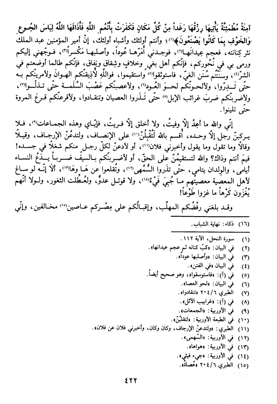 {وَضَرَبَ اللَّهُ مَثَلًا قَرْيَةً كَانَتْ آمِنَةً مُطْمَئِنَّةً يَأْتِيهَا رِزْقُهَا رَغَدًا مِنْ كُلِّ مَكَانٍ فَكَفَرَتْ بِأَنْعُمِ اللَّهِ فَأَذَاقَهَا اللَّهُ لِبَاسَ الْجُوعِ وَالْخَوْفِ بِمَا كَانُوا يَصْنَعُونَ} [النحل: 112] ، وَأَنْتُمْ أُولَئِكَ وَأَشْبَاهُ أُولَئِكَ، إِنَّ أَمِيرَ الْمُؤْمِنِينَ عَبْدَ الْمَلِكِ نَثَرَ كِنَانَتَهُ، فَعَجَمَ عِيدَانَهَا، فَوَجَدَنِي أَمَرَّهَا عُودًا، وَأَصْلَبَهَا مَكْسَرًا، فَوَجَّهَنِي إِلَيْكُمْ، وَرَمَى بِي فِي نُحُورِكُمْ، فَإِنَّكُمْ أَهْلُ بَغْيٍ وَخِلَافٍ وَشِقَاقٍ وَنِفَاقٍ، فَإِنَّكُمْ طَالَمَا أَوْضَعْتُمْ فِي الشَّرِّ، وَسَنَنْتُمْ سُنَنَ الْغَيِّ، فَاسْتَوْثِقُوا وَاسْتَقِيمُوا، فَوَاللَّهِ لَأُذِيقَنَّكُمُ الْهَوَانَ، وَلَأُمْرِيَنَّكُمْ بِهِ حَتَّى تَدِرُّوا، وَلَأَلْحُوَنَّكُمْ لَحْوَ الْعُودِ، وَلَأَعْصُبَنَّكُمْ عَصْبَ السَّلَمَةِ حَتَّى تُذَلُّوا، وَلَأَضْرِبَنَّكُمْ ضَرْبَ غَرَائِبِ الْإِبِلِ حَتَّى تَذَرُوا الْعِصْيَانَ وَتَنْقَادُوا، وَلَأَقْرَعَنَّكُمْ قَرْعَ الْمَرْوَةِ حَتَّى تَلِينُوا، إِنِّي وَاللَّهِ مَا أَعِدُ إِلَّا وَفَيْتُ، وَلَا أَخْلُقُ إِلَّا فَرَيْتُ، فَإِيَّايَ وَهَذِهِ الْجَمَاعَاتِ، فَلَا يَرْكَبَنَّ رَجُلٌ إِلَّا وَحْدَهُ، أُقْسِمُ بِاللَّهِ لَتُقْبِلُنَّ عَلَى الْإِنْصَافِ، وَلَتَدَعُنَّ الْإِرْجَافَ، وَقِيلًا وَقَالًا وَمَا تَقُولُ وَمَا يَقُولُ وَأَخْبَرَنِي فُلَانٌ، أَوْ لَأَدَعَنَّ لِكُلِّ رَجُلٍ مِنْكُمْ شُغْلًا فِي جَسَدِهِ! فِيمَ أَنْتُمْ وَذَاكَ؟ وَاللَّهِ لَتَسْتَقِيمُنَّ عَلَى الْحَقِّ، أَوْ لَأَضْرِبَنَّكُمْ بِالسَّيْفِ ضَرْبًا يَدَعُ النِّسَاءَ أَيَامَى، وَالْوِلْدَانَ يَتَامَى، حَتَّى تَذَرُوا السُّمَّهَى، وَتُقْلِعُوا عَنْ هَا وَهَا، أَلَا إِنَّهُ لَوْ سَاغَ لِأَهْلِ الْمَعْصِيَةِ مَعْصِيَتُهُمْ مَا جُبِيَ فَيْءٌ، وَلَا قُوتِلَ عَدُوٌّ، وَلَعُطِّلَتِ الثُّغُورُ، وَلَوْلَا أَنَّهُمْ يُغْزَوْنَ كَرْهًا مَا غُزُوا طَوْعًا!