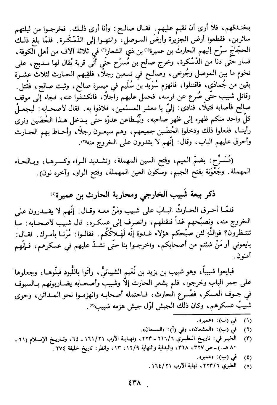 بِخَنْدَقِهِمْ، فَلَا أَرَى أَنْ نُقِيمَ عَلَيْهِمْ. فَقَالَ صَالِحٌ: وَأَنَا أَرَى ذَلِكَ. فَخَرَجُوا مِنْ لَيْلَتِهِمْ سَائِرِينَ، فَقَطَعُوا أَرْضَ الْجَزِيرَةِ وَأَرْضَ الْمَوْصِلِ، وَانْتَهَوْا إِلَى الدَّسْكَرَةِ. فَلَمَّا بَلَغَ ذَلِكَ الْحَجَّاجَ سَرَّحَ إِلَيْهِمُ الْحَارِثَ بْنَ عُمَيْرَةَ بْنِ ذِي الشِّعَارِ فِي ثَلَاثَةِ آلَافٍ مِنْ أَهْلِ الْكُوفَةِ، فَسَارَ حَتَّى دَنَا مِنَ الدَّسْكَرَةِ، وَخَرَجَ صَالِحُ بْنُ مُسَرِّحٍ حَتَّى أَتَى قَرْيَةً يُقَالُ لَهَا مَدْبَجُ عَلَى تُخُومِ مَا بَيْنَ الْمَوْصِلِ وَجُوخَى، وَصَالِحٌ فِي تِسْعِينَ رَجُلًا، فَلَقِيَهُمُ الْحَارِثُ لِثَلَاثَ عَشْرَةَ بَقِينَ مِنْ جُمَادَى، فَاقْتَتَلُوا، فَانْهَزَمَ سُوَيْدُ بْنُ سُلَيْمٍ فِي مَيْسَرَةِ صَالِحٍ، وَثَبَتَ صَالِحٌ، فَقُتِلَ، وَقَاتَلَ شَبِيبٌ حَتَّى صُرِعَ عَنْ فَرَسِهِ، فَحَمَلَ عَلَيْهِمْ رَاجِلًا، فَانْكَشَفُوا عَنْهُ، فَجَاءَ إِلَى مَوْقِفٍ صَالِحٍ فَأَصَابَهُ قَتِيلًا، فَنَادَى: إِلَيَّ يَا مَعْشَرَ الْمُسْلِمِينَ، فَلَاذُوا بِهِ. فَقَالَ لِأَصْحَابِهِ: لِيَجْعَلْ كُلُّ وَاحِدٍ مِنْكُمْ ظَهْرَهُ إِلَى ظَهْرِ صَاحِبِهِ، وَلِيُطَاعِنْ عَدُوَّهُ حَتَّى يَدْخُلَ هَذَا الْحُصَيْنَ وَنَرَى رَأْيَنَا، فَفَعَلُوا ذَلِكَ وَدَخَلُوا الْحُصَيْنَ جَمِيعُهُمْ، وَهُمْ سَبْعُونَ رَجُلًا، وَأَحَاطَ بِهِمُ الْحَارِثُ وَأَحْرَقَ عَلَيْهِمُ الْبَابَ، وَقَالَ: إِنَّهُمْ لَا يَقْدِرُونَ عَلَى الْخُرُوجِ مِنْهُ.