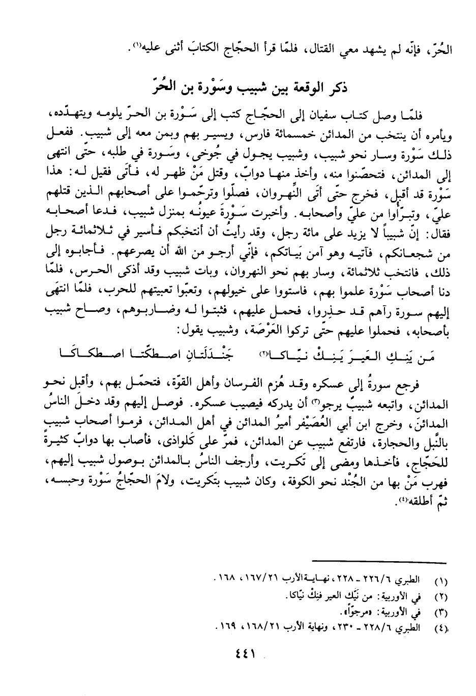 فَلَمَّا وَصَلَ كِتَابُ سُفْيَانَ إِلَى الْحَجَّاجِ كَتَبَ إِلَى سَوْرَةَ بْنِ الْحُرِّ يَلُومُهُ وَيَتَهَدَّدُهُ، وَيَأْمُرُهُ أَنْ يَنْتَخِبَ مِنَ الْمَدَائِنِ خَمْسَمِائَةِ فَارِسٍ، وَيَسِيرَ بِهِمْ وَبِمَنْ مَعَهُ إِلَى شَبِيبٍ. فَفَعَلَ ذَلِكَ سَوْرَةُ وَسَارَ نَحْوَ شَبِيبٍ، وَشَبِيبٌ يَجُولُ فِي جُوخَى، وَسَوْرَةُ فِي طَلَبِهِ، حَتَّى انْتَهَى إِلَى الْمَدَائِنِ، فَتَحَصَّنُوا مِنْهُ، وَأَخَذَ مِنْهَا دَوَابَّ وَقَتَلَ مَنْ ظَهَرَ لَهُ، فَأَتَى فَقِيلَ لَهُ: هَذَا سَوْرَةُ قَدْ أَقْبَلَ. فَخَرَجَ حَتَّى أَتَى النَّهْرَوَانَ، فَصَلُّوا وَتَرَحَّمُوا عَلَى أَصْحَابِهِمُ الَّذِينَ قَتَلَهُمْ عَلِيٌّ، وَتَبَرَّءُوا مِنْ عَلِيٍّ وَأَصْحَابِهِ. وَأَخْبَرَتْ سَوْرَةَ عُيُونُهُ بِمَنْزِلِ شَبِيبٍ، فَدَعَا أَصْحَابَهُ فَقَالَ: إِنَّ شَبِيبًا لَا يَزِيدُ عَلَى مِائَةِ رَجُلٍ، وَقَدْ رَأَيْتُ أَنْ أَنْتَخِبَكُمْ فَأَسِيرُ فِي ثَلَاثِمِائَةِ رَجُلٍ مِنْ شُجْعَانِكُمْ، فَآتِيهِ وَهُوَ آمِنٌ بَيَاتَكُمْ، فَإِنِّي أَرْجُو مِنَ اللَّهِ أَنْ يَصْرَعَهُمْ. فَأَجَابُوا إِلَى ذَلِكَ، فَانْتَخَبَ ثَلَاثَمِائَةٍ وَسَارَ بِهِمْ نَحْوَ النَّهْرَوَانِ، وَبَاتَ شَبِيبٌ وَقَدْ أَذْكَى الْحَرَسَ، فَلَمَّا دَنَا أَصْحَابُ سَوْرَةَ عَلِمُوا بِهِمْ، فَاسْتَوَوْا عَلَى خُيُولِهِمْ، وَتَعَبَّوْا تَعْبِيَتَهُمْ لِلْحَرْبِ، فَلَمَّا انْتَهَى إِلَيْهِمْ سَوْرَةُ رَآهُمْ قَدْ حَذِرُوا، فَحَمَلَ عَلَيْهِمْ، فَثَبَتُوا لَهُ وَضَارَبُوهُمْ، وَصَاحَ شَبِيبٌ بِأَصْحَابِهِ، فَحَمَلُوا عَلَيْهِمْ حَتَّى تَرَكُوا الْعَرْصَةَ، وَشَبِيبٌ يَقُولُ: مَنْ يَنِكِ الْعَيْرَ يَنِكْ نَيَّاكَا جَنْدَلَتَانِ اصْطَكَّتَا اصْطِكَاكَا
