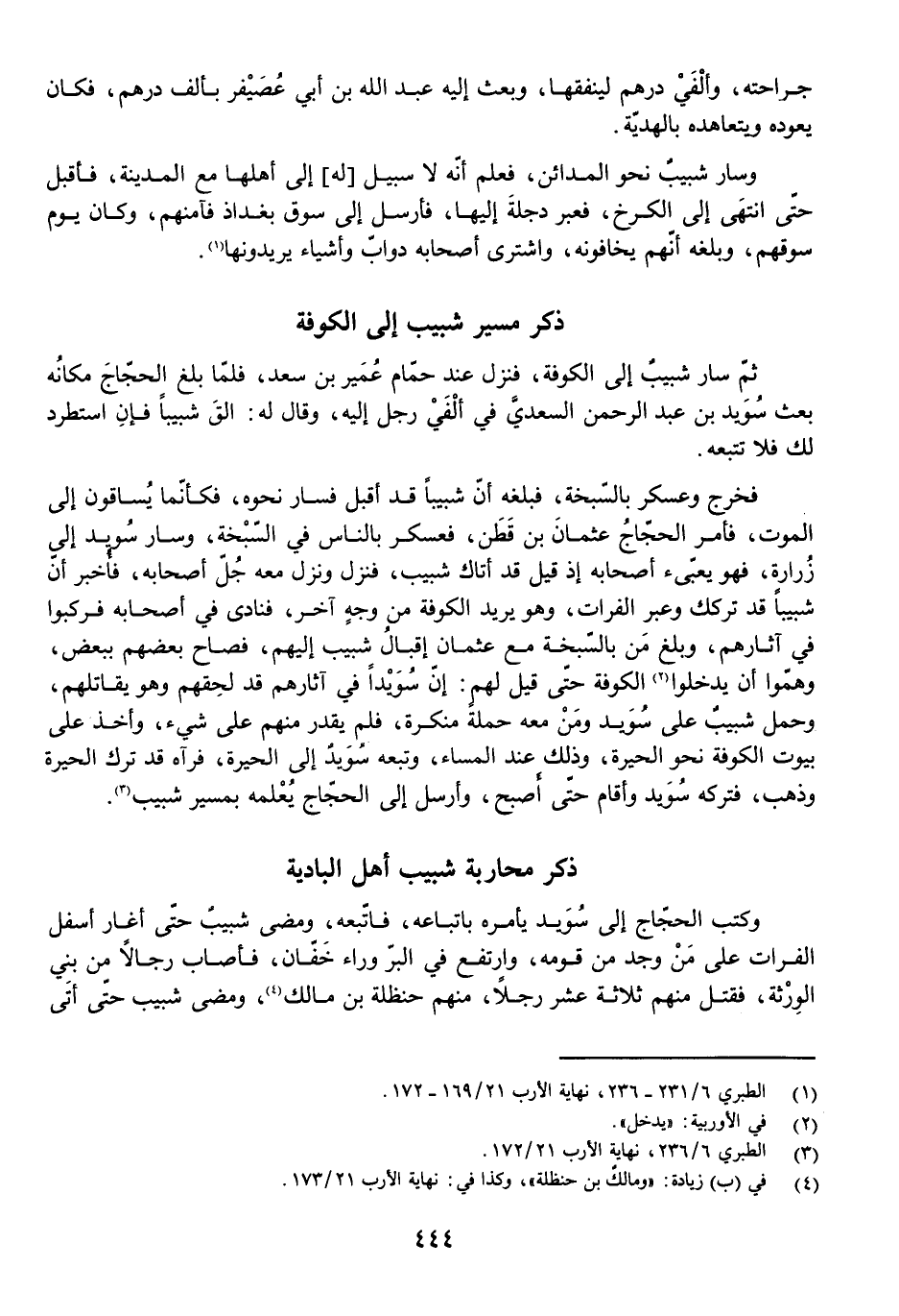 فَخَرَجَ وَعَسْكَرَ بِالسَّبْخَةِ، فَبَلَغَهُ أَنَّ شَبِيبًا قَدْ أَقْبَلَ، فَسَارَ نَحْوَهُ، فَكَأَنَّمَا يُسَاقُونَ إِلَى الْمَوْتِ، فَأَمَرَ الْحَجَّاجُ عُثْمَانَ بْنَ قَطَنٍ، فَعَسْكَرَ بِالنَّاسِ فِي السَّبْخَةِ، وَسَارَ سُوَيْدٌ إِلَى زُرَارَةَ، فَهُوَ يُعَبِّئُ أَصْحَابَهُ إِذْ قِيلَ: قَدْ أَتَاكَ شَبِيبٌ، فَنَزَلَ وَنَزَلَ مَعَهُ جُلُّ أَصْحَابِهِ، فَأُخْبِرَ أَنَّ شَبِيبًا قَدْ تَرَكَكَ وَعَبَرَ الْفُرَاتَ وَهُوَ يُرِيدُ الْكُوفَةَ مِنْ وَجْهٍ آخَرَ، فَنَادَى فِي أَصْحَابِهِ فَرَكِبُوا فِي آثَارِهِمْ، وَبَلَغَ مَنْ بِالسَّبْخَةِ مَعَ عُثْمَانَ إِقْبَالُ شَبِيبٍ إِلَيْهِمْ، فَصَاحَ بَعْضُهُمْ بِبَعْضٍ، وَهَمُّوا أَنْ يَدْخُلُوا الْكُوفَةَ حَتَّى قِيلَ لَهُمْ: إِنَّ سُوَيْدًا فِي آثَارِهِمْ قَدْ لَحِقَهُمْ وَهُوَ يُقَاتِلُهُمْ، وَحَمَلَ شَبِيبٌ عَلَى سُوَيْدٍ وَمَنْ كَانَ مَعَهُ حَمْلَةً مُنْكَرَةً، فَلَمْ يَقْدِرْ مِنْهُمْ عَلَى شَيْءٍ، وَأَخَذَ عَلَى بُيُوتِ الْكُوفَةِ نَحْوَ الْحِيرَةِ، وَذَلِكَ عِنْدَ الْمَسَاءِ، وَتَبِعَهُ سُوَيْدٌ إِلَى الْحِيرَةِ، فَرَآهُ قَدْ تَرَكَ الْحِيرَةَ وَذَهَبَ، فَتَرَكَهُ سُوَيْدٌ وَأَقَامَ حَتَّى أَصْبَحَ، وَأَرْسَلَ إِلَى الْحَجَّاجِ يُعْلِمُهُ بِمَسِيرِ شَبِيبٍ.