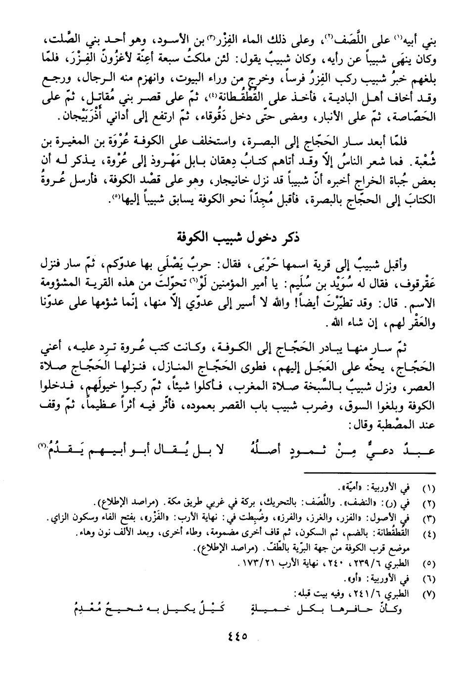 ثُمَّ سَارَ مِنْهَا يُبَادِرُ الْحَجَّاجَ إِلَى الْكُوفَةِ، وَكَانَتْ كُتُبُ عُرْوَةَ تَرِدُ عَلَيْهِ، أَعْنِي الْحَجَّاجَ، يَحُثُّهُ عَلَى الْعَجَلِ إِلَيْهِمْ، فَطَوَى الْحَجَّاجُ الْمَنَازِلَ، فَنَزَلَهَا الْحَجَّاجُ صَلَاةَ الْعَصْرِ، وَنَزَلَ شَبِيبٌ بِالسَّبْخَةِ صَلَاةَ الْمَغْرِبِ، فَأَكَلُوا شَيْئًا ثُمَّ رَكِبُوا خُيُولَهُمْ، فَدَخَلُوا الْكُوفَةَ وَبَلَغُوا السُّوقَ، وَضَرَبَ شَبِيبٌ بَابَ الْقَصْرِ بِعَمُودِهِ، فَأَثَّرَ فِيهِ أَثَرًا عَظِيمًا، ثُمَّ وَقَفَ عِنْدَ الْمِصْطَبَةِ وَقَالَ: