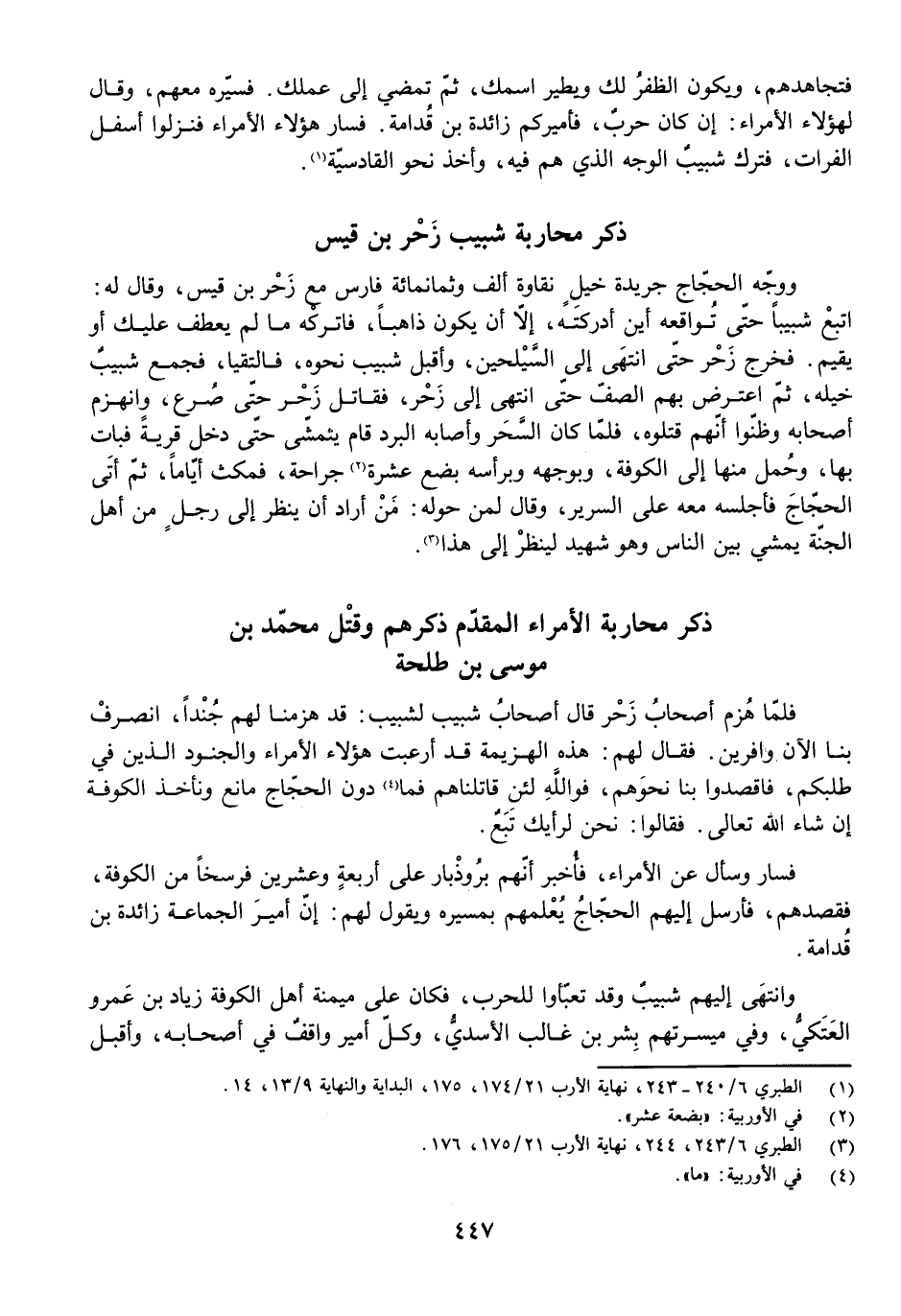 فَتُجَاهِدُهُمْ، وَيَكُونُ الظَّفَرُ لَكَ وَيَطِيرُ اسْمُكَ، ثُمَّ تَمْضِي إِلَى عَمَلِكَ. فَسَيَّرَهُ مَعَهُمْ، وَقَالَ لِهَؤُلَاءِ الْأُمَرَاءِ: إِنْ كَانَ حَرْبٌ فَأَمِيرُكُمْ زَائِدَةُ بْنُ قُدَامَةَ. فَسَارَ هَؤُلَاءِ الْأُمَرَاءُ فَنَزَلُوا أَسْفَلَ الْفُرَاتِ، فَتَرَكَ شَبِيبٌ الْوَجْهَ الَّذِي هُمْ فِيهِ، وَأَخَذَ نَحْوَ الْقَادِسِيَّةِ.