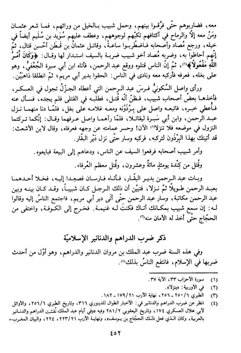 مَعَهُ، فَضَارَبُوهُمْ حَتَّى فَرَّقُوا بَيْنَهُمْ، وَحَمَلَ شَبِيبٌ بِالْخَيْلِ مِنْ وَرَائِهِمْ، فَمَا شَعَرَ عُثْمَانُ وَمَنْ مَعَهُ إِلَّا وَالرِّمَاحُ فِي أَكْتَافِهِمْ تُكِبُّهُمْ لِوُجُوهِهِمْ، وَعَطَفَ عَلَيْهِمْ سُوَيْدُ بْنُ سُلَيْمٍ أَيْضًا فِي خَيْلِهِ، وَرَجَعَ مُصَادٌ وَأَصْحَابُهُ فَاضْطَرَبُوا سَاعَةً، وَقَاتَلَ عُثْمَانُ بْنُ قَطَنٍ أَحْسَنَ قِتَالٍ، ثُمَّ إِنَّهُمْ أَحَاطُوا بِهِ، وَضَرَبَهُ مُصَادٌ أَخُو شَبِيبٍ ضَرْبَةً بِالسَّيْفِ اسْتَدَارَ لَهَا وَقَالَ: {وَكَانَ أَمْرُ اللَّهِ مَفْعُولًا} [الأحزاب: 37] ، ثُمَّ إِنَّ النَّاسَ قَتَلُوهُ، وَوَقَعَ عَبْدُ الرَّحْمَنِ، فَأَتَاهُ ابْنُ أَبِي سَبْرَةَ الْجُعْفِيُّ، وَهُوَ عَلَى بَغْلِهِ، فَعَرَفَهُ فَأَرْكَبَهُ مَعَهُ، وَنَادَى فِي النَّاسِ: الْحَقُوا بِدَيْرِ أَبِي مَرْيَمَ، ثُمَّ انْطَلَقَا ذَاهِبَيْنِ.