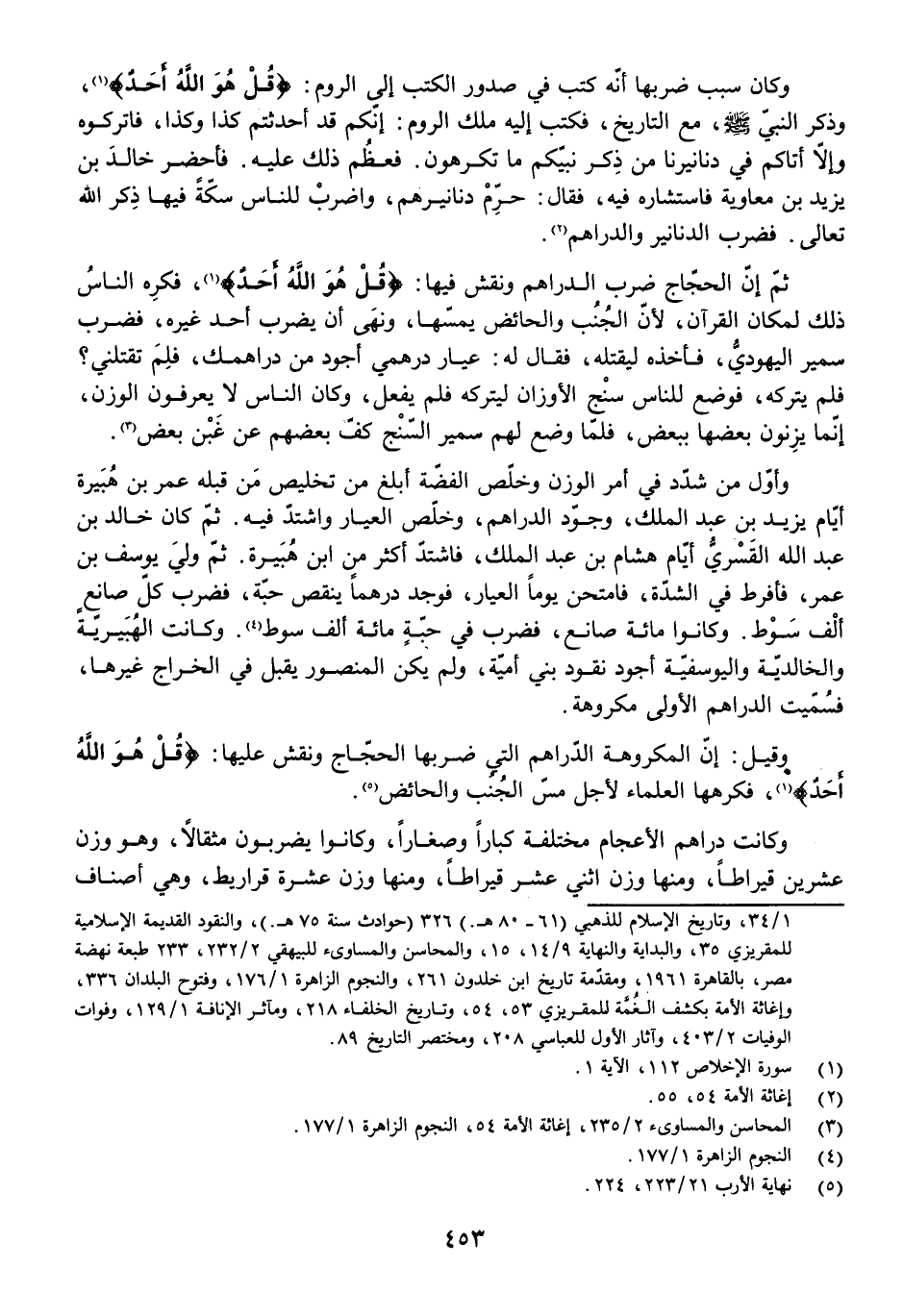 ثُمَّ إِنَّ الْحَجَّاجَ ضَرَبَ الدَّرَاهِمَ وَنَقَشَ فِيهَا: {قُلْ هُوَ اللَّهُ أَحَدٌ} [الإخلاص: 1] ، فَكَرِهَ النَّاسُ ذَلِكَ لِمَكَانِ الْقُرْآنِ، لِأَنَّ الْجُنُبَ وَالْحَائِضَ يَمَسُّهَا، وَنَهَى أَنْ يَضْرِبَ أَحَدٌ غَيْرُهُ، فَضَرَبَ سُمَيْرٌ الْيَهُودِيُّ، فَأَخَذَهُ لِيَقْتُلَهُ، فَقَالَ لَهُ: عِيَارُ دِرْهَمِي أَجْوَدُ مِنْ دَرَاهِمِكَ، فَلِمَ تَقْتُلُنِي؟ فَلَمْ يَتْرُكْهُ، فَوَضَعَ لِلنَّاسِ سِنَجَ الْأَوْزَانِ لِيَتْرُكَهُ فَلَمْ يَفْعَلْ، وَكَانَ النَّاسُ لَا يَعْرِفُونَ الْوَزْنَ، إِنَّمَا يَزِنُونَ بَعْضَهَا بِبَعْضٍ، فَلَمَّا وَضَعَ لَهُمْ سُمَيْرٌ السِّنَجَ كَفَّ بَعْضُهُمْ عَنْ غَبْنِ بَعْضٍ.