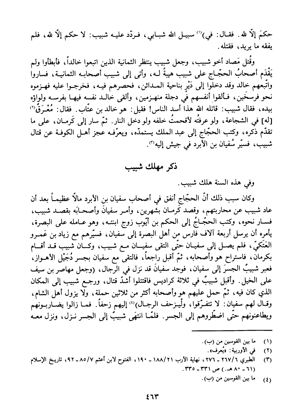 لَا حُكْمَ إِلَّا لِلَّهِ. فَقَالَ: فِي) سَبِيلِ اللَّهِ شَبَابِي. فَرَدَّدَ عَلَيْهِ شَبِيبٌ: لَا حُكْمَ إِلَّا لِلَّهِ. فَلَمْ يَفْقَهْ مَا يُرِيدُ، فَقَتَلَهُ.