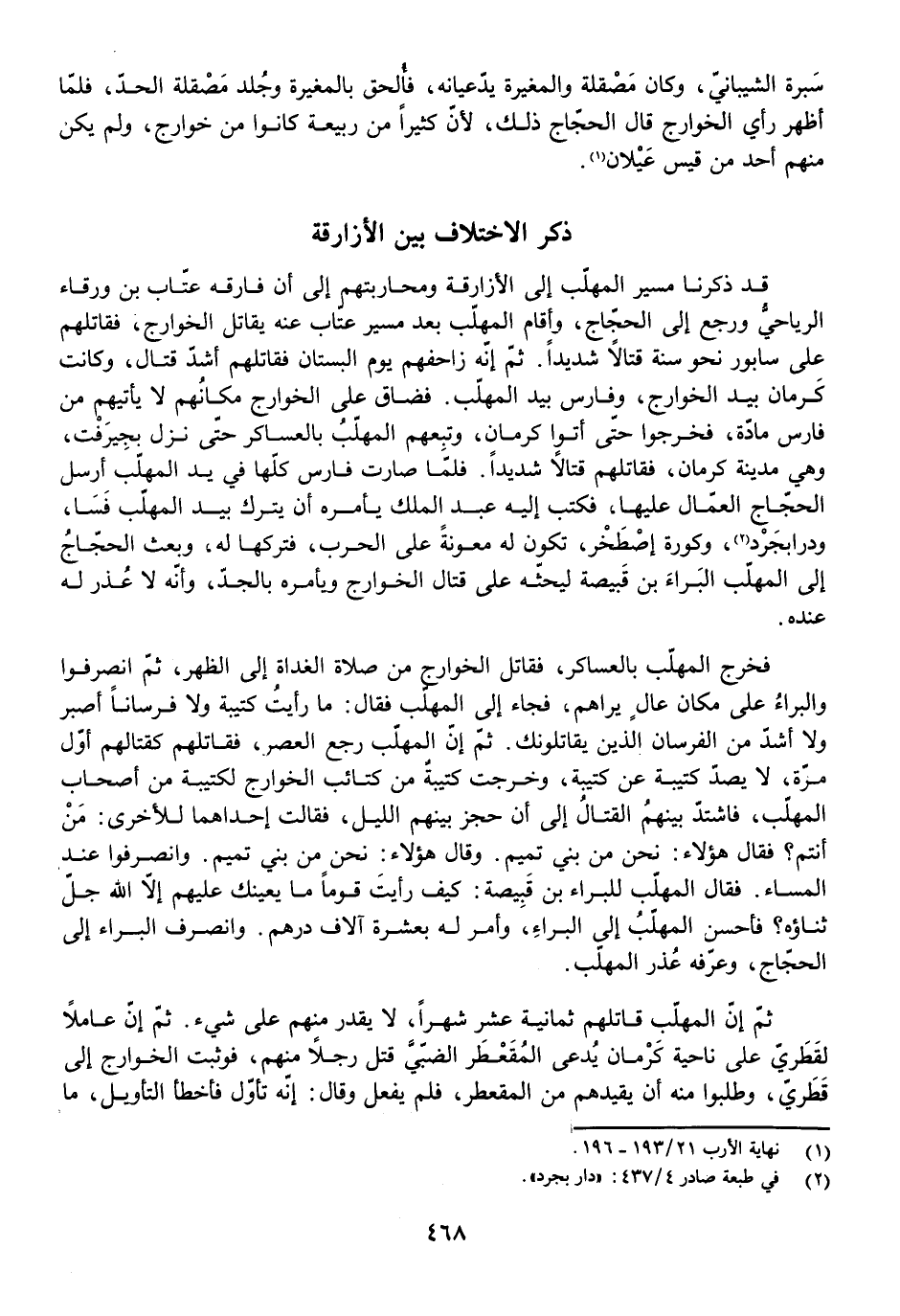 قَدْ ذَكَرْنَا مَسِيرَ الْمُهَلَّبِ إِلَى الْأَزَارِقَةِ وَمُحَارَبَتَهُمْ إِلَى أَنْ فَارَقَهُ عَتَّابُ بْنُ وَرْقَاءَ الرِّيَاحِيُّ وَرَجَعَ إِلَى الْحَجَّاجِ، وَأَقَامَ الْمُهَلَّبُ بَعْدَ مَسِيرِ عَتَّابٍ عَنْهُ يُقَاتِلُ الْخَوَارِجَ، فَقَاتَلَهُمْ عَلَى سَابُورَ نَحْوَ سَنَةٍ قِتَالًا شَدِيدًا. ثُمَّ إِنَّهُ زَاحَفَهُمْ يَوْمَ الْبُسْتَانِ فَقَاتَلَهُمْ أَشَدَّ قِتَالٍ، وَكَانَتْ كَرْمَانُ بِيَدِ الْخَوَارِجِ، وَفَارِسَ بِيَدِ الْمُهَلَّبِ. فَضَاقَ عَلَى الْخَوَارِجِ مَكَانُهُمْ، لَا يَأْتِيهِمْ مِنْ فَارِسَ مَادَّةٌ، فَخَرَجُوا حَتَّى أَتَوْا كَرْمَانَ، وَتَبِعَهُمُ الْمُهَلَّبُ بِالْعَسَاكِرِ حَتَّى نَزَلَ بِجِيرَفْتَ، وَهِيَ مَدِينَةُ كَرْمَانَ، فَقَاتَلَهُمْ قِتَالًا شَدِيدًا. فَلَمَّا صَارَتْ فَارِسُ كُلُّهَا فِي يَدِ الْمُهَلَّبِ أَرْسَلَ الْحَجَّاجُ الْعُمَّالَ عَلَيْهَا، فَكَتَبَ إِلَيْهِ عَبْدُ الْمَلِكِ يَأْمُرُهُ أَنْ يَتْرُكَ بِيَدِ الْمُهَلَّبِ فَسَا، وَدَرَابَجَرْدَ، وَكُورَةَ إِصْطَخْرَ، تَكُونُ لَهُ مَعُونَةً عَلَى الْحَرْبِ، فَتَرَكَهَا لَهُ، وَبَعَثَ الْحَجَّاجُ إِلَى الْمُهَلَّبِ الْبَرَاءَ بْنَ قَبِيصَةَ لِيُحِثَّهُ عَلَى قِتَالِ الْخَوَارِجِ، وَيَأْمُرَهُ بِالْجِدِّ، وَأَنَّهُ لَا عُذْرَ لَهُ عِنْدَهُ.