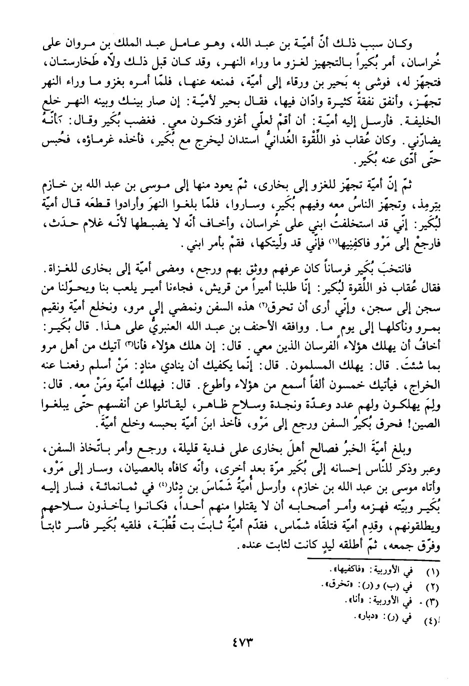 فَانْتَخَبَ بُكَيْرٌ فُرْسَانًا كَانَ عَرَفَهُمْ وَوَثِقَ بِهِمْ وَرَجَعَ، وَمَضَى أُمَيَّةُ إِلَى بُخَارَى لِلْغُزَاةِ. فَقَالَ عُقَابٌ ذُو اللِّقْوَةِ لِبُكَيْرٍ: إِنَّا طَلَبْنَا أَمِيرًا مِنْ قُرَيْشٍ، فَجَاءَنَا أَمِيرٌ يَلْعَبُ بِنَا وَيُحَوِّلُنَا مِنْ سِجْنٍ إِلَى سِجْنٍ، وَإِنِّي أَرَى أَنْ تَحْرِقَ هَذِهِ السُّفُنَ، وَنَمْضِيَ إِلَى مَرْوَ، وَنَخْلَعَ أُمَيَّةَ وَنُقِيمَ بِمَرْوَ وَنَأْكُلَهَا إِلَى يَوْمٍ مَا. وَوَافَقَهُ الْأَحْنَفُ بْنُ عَبْدِ اللَّهِ الْعَنْبَرِيُّ عَلَى هَذَا. قَالَ بُكَيْرٌ: أَخَافَ أَنْ يَهْلِكَ هَؤُلَاءِ الْفُرْسَانُ الَّذِينَ مَعِي. قَالَ: إِنْ هَلَكَ هَؤُلَاءِ فَأَنَا أَتِيكَ مِنْ أَهْلِ مَرْوَ بِمَا شِئْتَ. قَالَ: يَهْلِكُ الْمُسْلِمُونَ. قَالَ: إِنَّمَا يَكْفِيكَ أَنْ يُنَادِيَ مُنَادٍ: مَنْ أَسْلَمَ رَفَعْنَا عَنْهُ الْخَرَاجَ، فَيَأْتِيكَ خَمْسُونَ أَلْفًا أَسْمَعُ مِنْ هَؤُلَاءِ وَأَطْوَعُ. قَالَ: فَيَهْلِكُ أُمَيَّةُ وَمَنْ مَعَهُ. قَالَ: وَلِمَ يَهْلِكُونَ وَلَهُمْ عَدَدٌ وَعِدَّةٌ وَنَجْدَةٌ وَسِلَاحٌ ظَاهِرٌ، لِيُقَاتِلُوا عَنْ أَنْفُسِهِمْ حَتَّى يَبْلُغُوا الصِّينَ! فَحَرَقَ بُكَيْرٌ السُّفُنَ وَرَجَعَ إِلَى مَرْوَ، فَأَخَذَ ابْنُ أُمَيَّةَ بِحَبْسِهِ وَخَلْعِ أُمَيَّةَ.