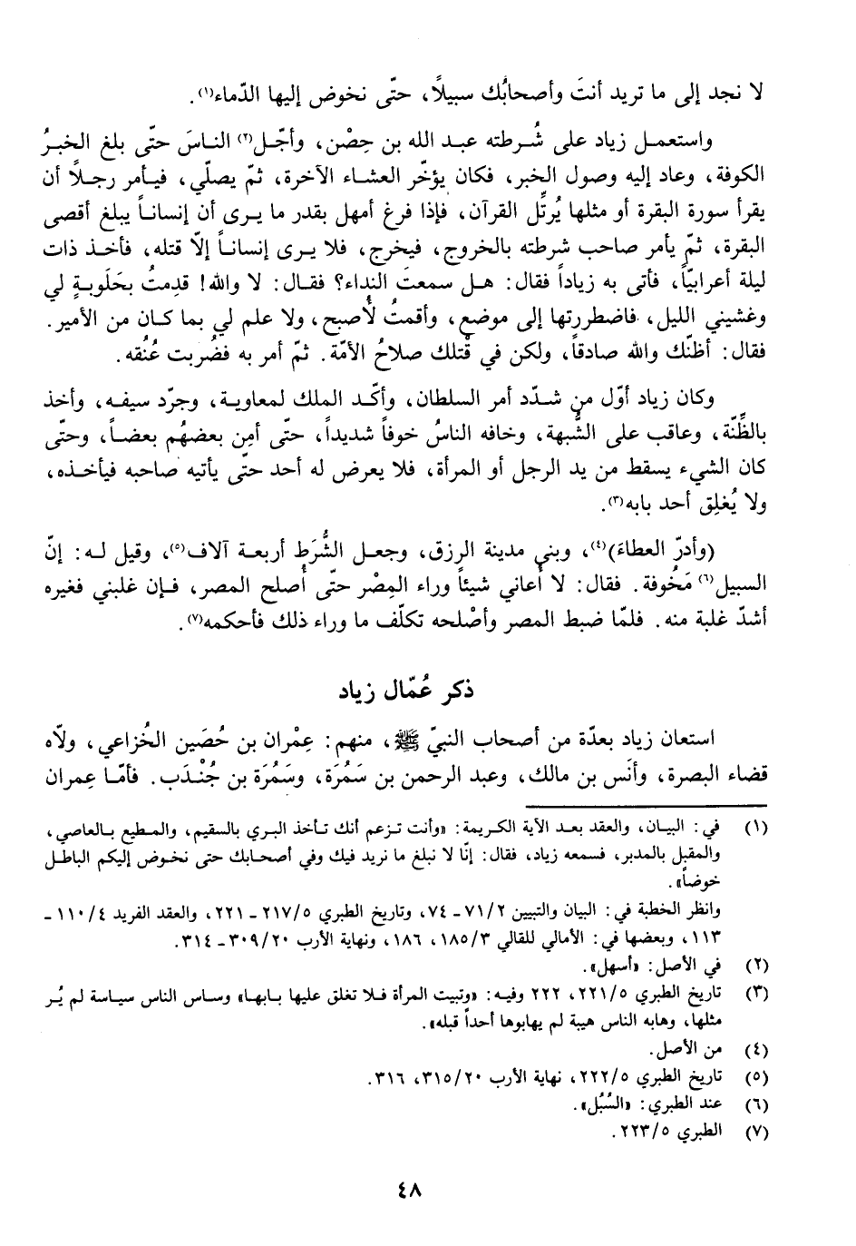 وَاسْتَعْمَلَ زِيَادٌ عَلَى شُرْطَتِهِ عَبْدَ اللَّهِ بْنَ حِصْنٍ، وَأَجَّلَ النَّاسَ حَتَّى بَلَغَ الْخَبَرُ الْكُوفَةَ وَعَادَ إِلَيْهِ وُصُولُ الْخَبَرِ، فَكَانَ يُؤَخِّرُ الْعِشَاءَ الْآخِرَةَ ثُمَّ يُصَلِّي فَيَأْمُرُ رَجُلًا أَنْ يَقْرَأَ سُورَةَ الْبَقَرَةِ أَوْ مِثْلَهَا يُرَتِّلُ الْقُرْآنَ، فَإِذَا فَرَغَ أَمْهَلَ بِقَدْرِ مَا يَرَى أَنَّ إِنْسَانًا يَبْلُغُ أَقْصَى الْبَقَرَةِ، ثُمَّ يَأْمُرُ صَاحِبَ شُرْطَتِهِ بِالْخُرُوجِ، فَيَخْرُجُ فَلَا يَرَى إِنْسَانًا إِلَّا قَتَلَهُ، فَأَخَذَ ذَاتَ لَيْلَةٍ أَعْرَابِيًّا فَأَتَى بِهِ زِيَادًا فَقَالَ: هَلْ سَمِعْتَ النِّدَاءَ؟ فَقَالَ: لَا وَاللَّهِ قَدِمْتُ بِحَلُوبَةٍ لِي وَغَشِيَنِي اللَّيْلُ فَاضْطَرَرْتُهَا إِلَى مَوْضِعٍ وَأَقَمْتُ لِأُصْبِحَ وَلَا عِلْمَ لِي بِمَا كَانَ مِنَ الْأَمِيرِ. فَقَالَ: أَظُنُّكَ وَاللَّهِ صَادِقًا وَلَكِنْ فِي قَتْلِكَ صَلَاحُ الْأُمَّةِ. ثُمَّ أَمَرَ بِهِ فَضُرِبَتْ عُنُقُهُ.