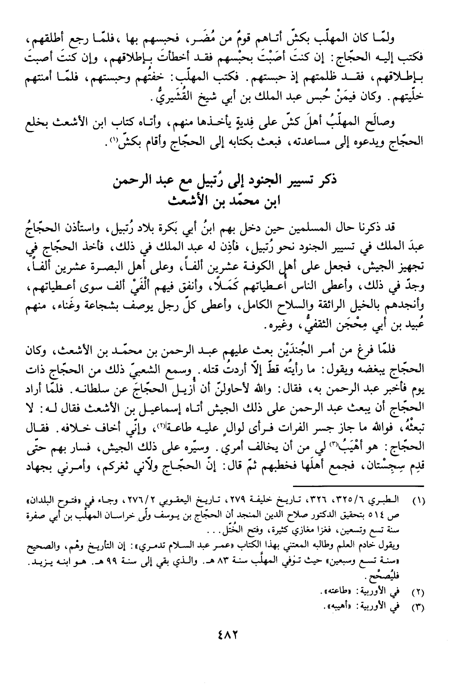 فَلَمَّا فَرَغَ مِنْ أَمْرِ الْجُنْدَيْنِ بَعَثَ عَلَيْهِمْ عَبْدَ الرَّحْمَنِ بْنَ مُحَمَّدِ بْنِ الْأَشْعَثِ، وَكَانَ الْحَجَّاجُ يُبْغِضُهُ وَيَقُولُ: مَا رَأَيْتُهُ قَطُّ إِلَّا أَرَدْتُ قَتْلَهُ. وَسَمِعَ الشَّعْبِيُّ ذَلِكَ مِنَ الْحَجَّاجِ ذَاتَ يَوْمٍ فَأَخْبَرَ عَبْدَ الرَّحْمَنِ بِهِ، فَقَالَ: وَاللَّهِ لَأُحَاوِلَنَّ أَنْ أُزِيلَ الْحَجَّاجَ عَنْ سُلْطَانِهِ. فَلَمَّا أَرَادَ الْحَجَّاجُ أَنْ يَبْعَثَ عَبْدَ الرَّحْمَنِ عَلَى ذَلِكَ الْجَيْشِ أَتَاهُ إِسْمَاعِيلُ بْنُ الْأَشْعَثِ فَقَالَ لَهُ: لَا تَبْعَثْهُ، فَوَاللَّهِ مَا جَازَ جِسْرَ الْفُرَاتِ فَرَأَى لِوَالٍ عَلَيْهِ طَاعَةً، وَإِنِّي أَخَافُ خِلَافَهُ. فَقَالَ الْحَجَّاجُ: هُوَ أَهْيَبُ لِي مِنْ أَنْ يُخَالِفَ أَمْرِي. وَسَيَّرَهُ عَلَى ذَلِكَ الْجَيْشِ، فَسَارَ بِهِمْ حَتَّى قَدِمَ سِجِسْتَانَ، فَجَمَعَ أَهْلَهَا فَخَطَبَهُمْ ثُمَّ قَالَ: إِنَّ الْحَجَّاجَ وَلَّانِي ثَغْرَكُمْ، وَأَمَرَنِي بِجِهَادِ