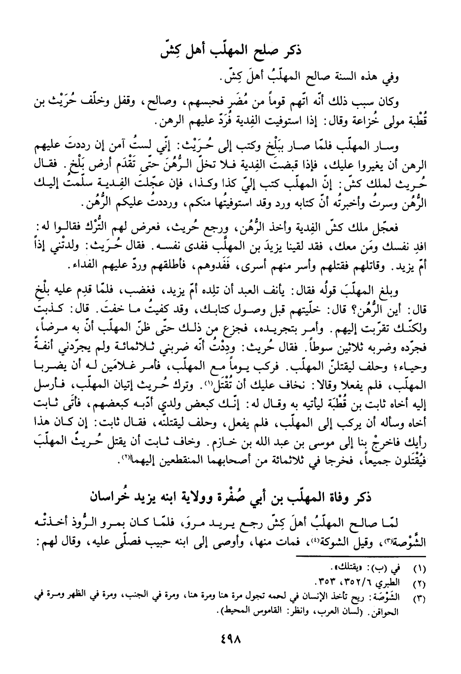 وَسَارَ الْمُهَلَّبُ، فَلَمَّا صَارَ بِبَلْخٍ كَتَبَ إِلَى حُرَيْثٍ: إِنِّي لَسْتُ آمَنُ إِنْ رَدَدْتُ عَلَيْهِمُ الرَّهْنَ أَنْ يُغِيرُوا عَلَيْكَ، فَإِذَا قَبَضْتَ الْفِدْيَةَ فَلَا تُخَلِّ الرَّهْنَ حَتَّى تَقْدَمَ أَرْضَ بَلْخٍ. فَقَالَ حُرَيْثٌ لِمَلِكِ كِشَّ: إِنَّ الْمُهَلَّبَ كَتَبَ إِلَيَّ كَذَا وَكَذَا، فَإِنْ عَجَّلْتَ الْفِدْيَةَ سَلَّمْتُ إِلَيْكَ الرَّهْنَ وَسِرْتُ وَأَخْبَرْتُهُ أَنَّ كِتَابَهُ وَرَدَ وَقَدِ اسْتَوْفَيْتُهَا مِنْكُمْ، وَرَدَدْتُ عَلَيْكُمُ الرَّهْنَ.