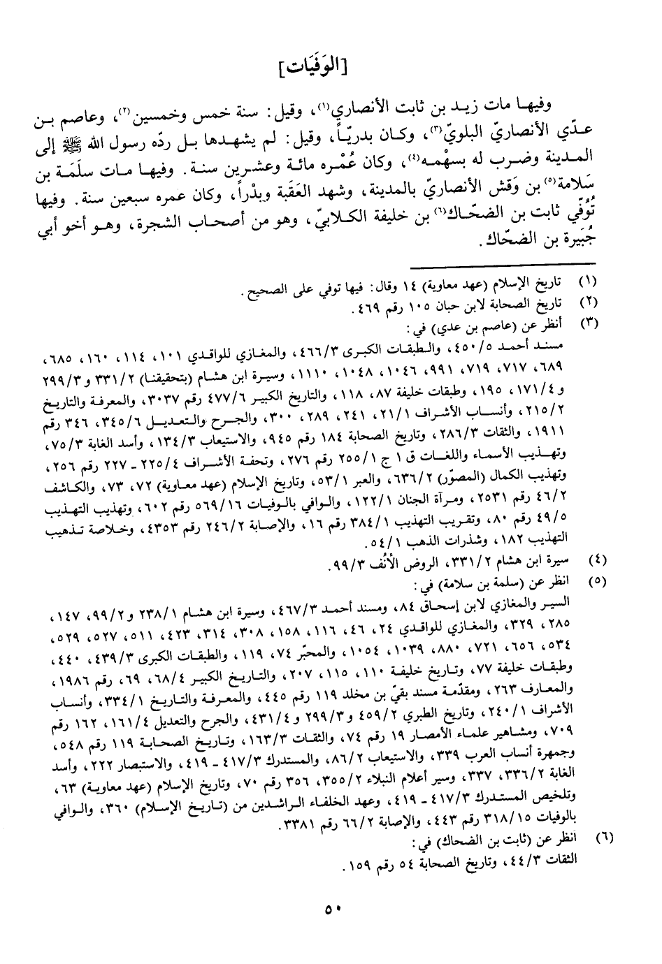 وَفِيهَا مَاتَ زَيْدُ بْنُ ثَابِتٍ الْأَنْصَارِيُّ، وَقِيلَ: سَنَةَ خَمْسٍ وَخَمْسِينَ، وَعَاصِمُ بْنُ عَدِيٍّ الْأَنْصَارِيُّ الْبَلَوِيُّ، وَكَانَ بَدْرِيًّا، وَقِيلَ: لَمْ يَشْهَدْهَا بَلْ رَدَّهُ رَسُولُ اللَّهِ - صَلَّى اللَّهُ عَلَيْهِ وَسَلَّمَ - إِلَى الْمَدِينَةِ وَضَرَبَ لَهُ بِسَهْمِهِ، وَكَانَ عُمُرُهُ مِائَةً وَعِشْرِينَ سَنَةً. وَفِيهَا مَاتَ سَلَمَةُ بْنُ سَلَامَةَ بْنِ وَقْشٍ الْأَنْصَارِيُّ بِالْمَدِينَةِ، وَشَهِدَ الْعَقَبَةَ وَبَدْرًا وَكَانَ عُمُرُهُ سَبْعِينَ سَنَةً. وَفِيهَا تُوُفِّيَ ثَابِتُ بْنُ الضَّحَّاكِ بْنِ خَلِيفَةَ الْكِلَابِيُّ، وَهُوَ مِنْ أَصْحَابِ الشَّجَرَةِ، وَهُوَ أَخُو أَبِي جُبَيْرَةَ بْنِ الضَّحَّاكِ.
