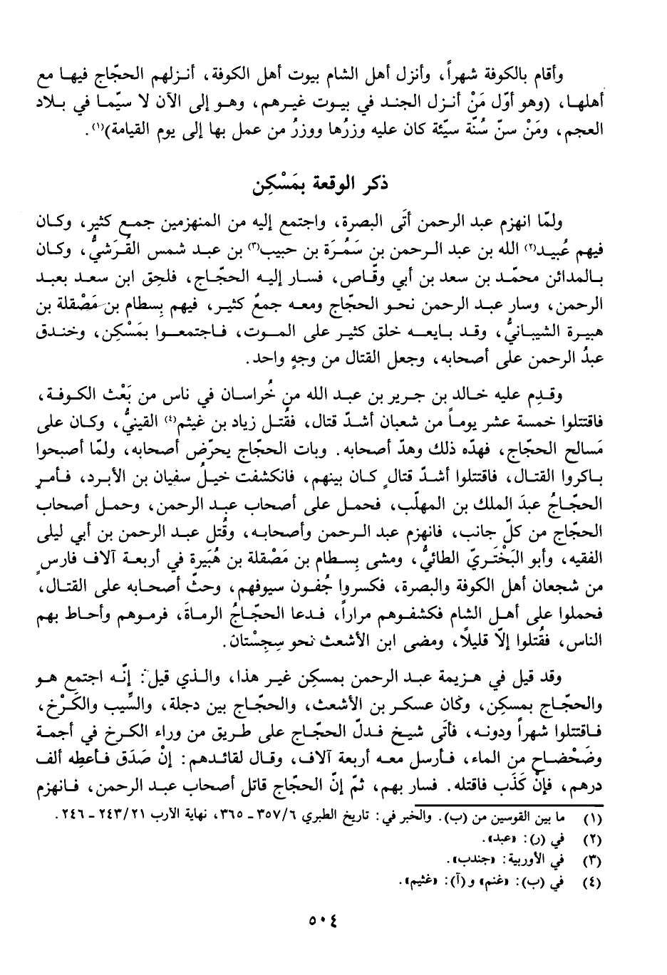 وَقَدْ قِيلَ فِي هَزِيمَةِ عَبْدِ الرَّحْمَنِ بِمَسْكِنٍ غَيْرُ هَذَا، وَالَّذِي قِيلَ: إِنَّهُ اجْتَمَعَ هُوَ وَالْحَجَّاجُ بِمَسْكِنٍ، وَكَانَ عَسْكَرُ ابْنِ الْأَشْعَثِ وَالْحَجَّاجِ بَيْنَ دِجْلَةَ وَالسِّيبِ وَالْكَرْخِ، فَاقْتَتَلُوا شَهْرًا وَدُونَهُ، فَأَتَى شَيْخٌ فَدَلَّ الْحَجَّاجَ عَلَى طَرِيقٍ مِنْ وَرَاءِ الْكَرْخِ فِي أَجَمَةٍ وَضَحْضَاحٍ مِنَ الْمَاءِ، فَأَرْسَلَ مَعَهُ أَرْبَعَةَ آلَافٍ وَقَالَ لِقَائِدِهِمْ: إِنْ صَدَقَ فَأَعْطِهِ أَلْفَ دِرْهَمٍ، فَإِنَّ كَذَبَ فَاقْتُلْهُ. فَسَارَ بِهِمْ، ثُمَّ إِنَّ الْحَجَّاجَ قَاتَلَ أَصْحَابَ عَبْدِ الرَّحْمَنِ، فَانْهَزَمَ