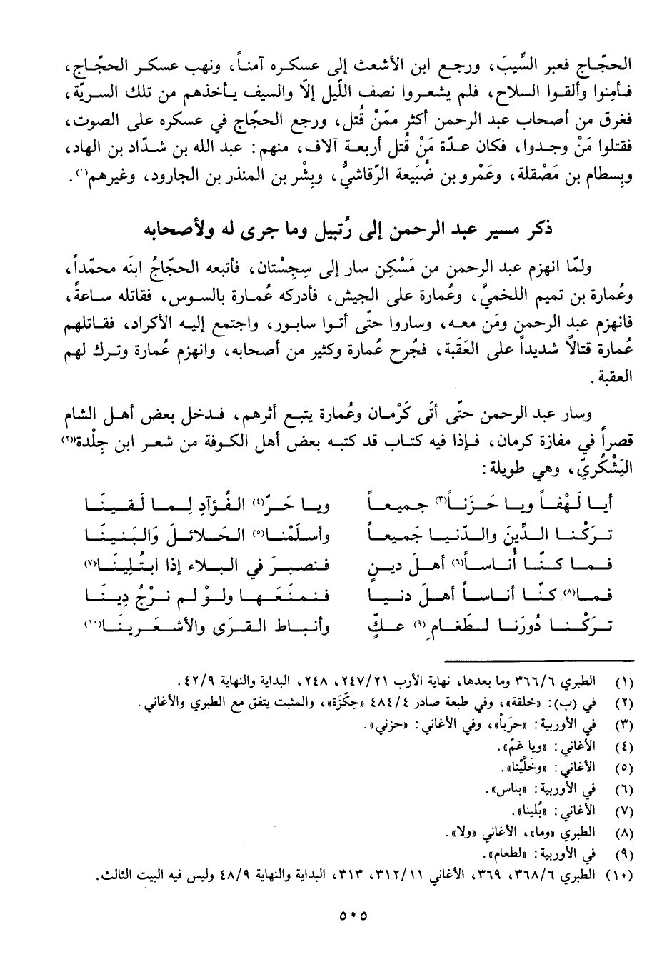 وَسَارَ عَبْدُ الرَّحْمَنِ حَتَّى أَتَى كَرْمَانَ وَعُمَارَةُ يَتْبَعُ أَثَرَهُمْ، فَدَخَلَ بَعْضُ أَهْلِ الشَّامِ قَصْرًا فِي مَفَازَةِ كَرْمَانَ، فَإِذَا فِيهِ كِتَابٌ قَدْ كَتَبَهُ بَعْضُ أَهْلِ الْكُوفَةِ مِنْ شِعْرِ ابْنِ جِلْدَةَ الْيَشْكُرِيِّ، وَهِيَ طَوِيلَةٌ: