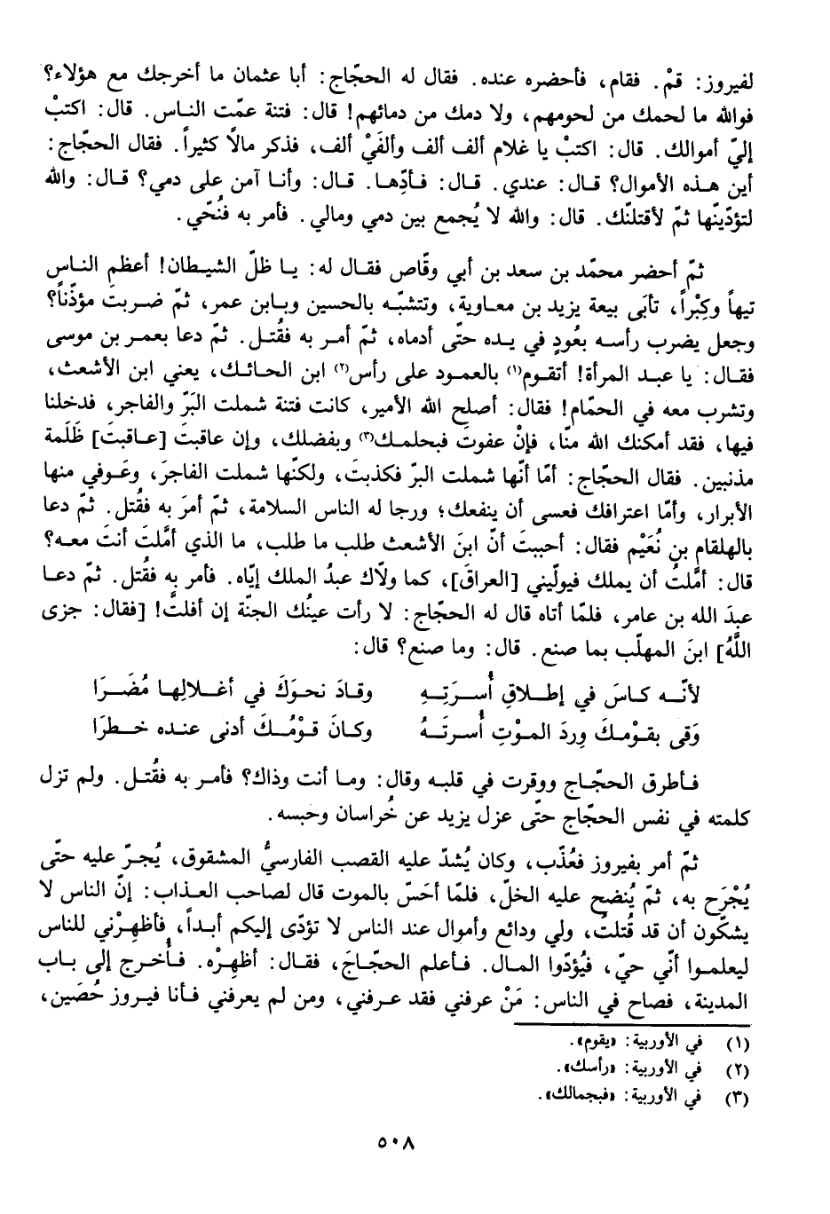 لِفَيْرُوزَ: قُمْ. فَقَامَ، فَأَحْضَرَهُ عِنْدَهُ. فَقَالَ لَهُ الْحَجَّاجُ: أَبَا عُثْمَانَ، مَا أَخْرَجَكَ مَعَ هَؤُلَاءِ؟ فَوَاللَّهِ مَا لَحْمُكَ مِنْ لُحُومِهِمْ، وَلَا دَمُكَ مِنْ دِمَائِهِمْ! قَالَ: فِتْنَةٌ عَمَّتِ النَّاسَ. قَالَ: اكْتُبْ إِلَيَّ أَمْوَالَكَ. قَالَ: اكْتُبْ يَا غُلَامُ أَلْفَ أَلْفٍ وَأَلْفَيْ أَلْفٍ، فَذَكَرَ مَالًا كَثِيرًا. فَقَالَ الْحَجَّاجُ: أَيْنَ هَذِهِ الْأَمْوَالُ؟ قَالَ: عِنْدِي. قَالَ: فَأَدِّهَا. قَالَ: وَأَنَا آمَنُ عَلَى دَمِي؟ قَالَ: وَاللَّهِ لَتُؤَدِّيَنَّهَا ثُمَّ لَأَقْتُلَنَّكَ. قَالَ: وَاللَّهِ لَا يُجْمَعُ بَيْنَ دَمِي وَمَالِي. فَأَمَرَ بِهِ فَنُحِّيَ.