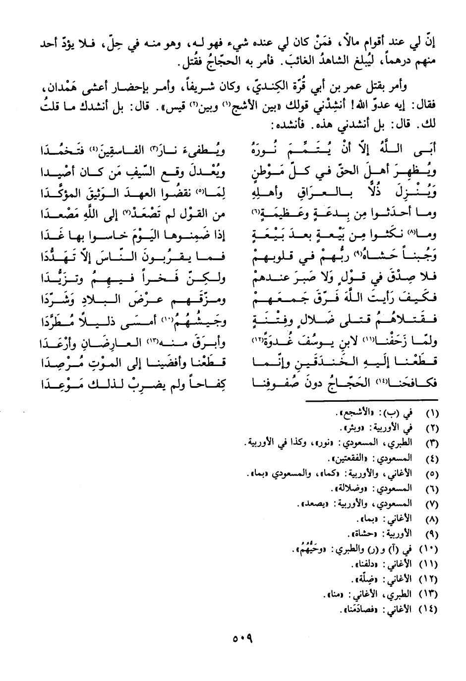 وَأَمَرَ بِقَتْلِ عُمَرَ بْنِ أَبِي قُرَّةَ الْكِنْدِيِّ، وَكَانَ شَرِيفًا، وَأَمَرَ بِإِحْضَارِ أَعْشَى هَمْدَانَ، فَقَالَ: إِيهِ عَدُوَّ اللَّهِ! أَنْشِدْنِي قَوْلَكَ بَيْنَ الْأَشَجِّ وَبَيْنَ قَيْسٍ. قَالَ: بَلْ أُنْشِدُكَ مَا قُلْتُ لَكَ. قَالَ: بَلْ أَنْشِدْنِي هَذِهِ. فَأَنْشَدَهُ:
