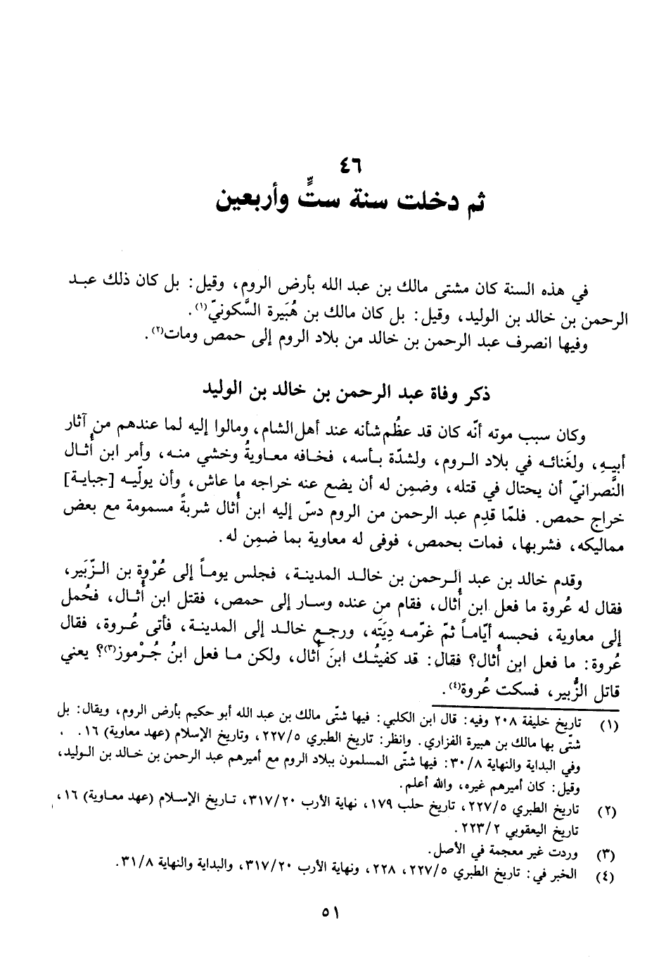ذِكْرُ وَفَاةِ عَبْدِ الرَّحْمَنِ بْنِ خَالِدِ بْنِ الْوَلِيدِ وَكَانَ سَبَبُ مَوْتِهِ أَنَّهُ كَانَ قَدْ عَظُمَ شَأْنُهُ عِنْدَ أَهْلِ الشَّامِ وَمَالُوا إِلَيْهِ لِمَا عِنْدَهُمْ مِنْ آثَارِ أَبِيهِ وَلِغَنَائِهِ فِي بِلَادِ الرُّومِ وَلِشِدَّةِ بَأْسِهِ، فَخَافَهُ مُعَاوِيَةُ وَخَشِيَ مِنْهُ وَأَمَرَ ابْنَ أُثَالٍ النَّصْرَانِيَّ أَنْ يَحْتَالَ فِي قَتْلِهِ وَضَمِنَ لَهُ أَنْ يَضَعَ عَنْهُ خَرَاجَهُ مَا عَاشَ وَأَنْ يُوَلِّيَهُ [جِبَايَةَ] خَرَاجِ حِمْصَ، فَلَمَّا قَدِمَ عَبْدُ الرَّحْمَنِ مِنَ الرُّومِ دَسَّ إِلَيْهِ ابْنُ أُثَالٍ شَرْبَةً مَسْمُومَةً مَعَ بَعْضِ مَمَالِيكِهِ، فَشَرِبَهَا، فَمَاتَ بِحِمْصَ، فَوَفَى لَهُ مُعَاوِيَةُ بِمَا ضَمِنَ لَهُ.