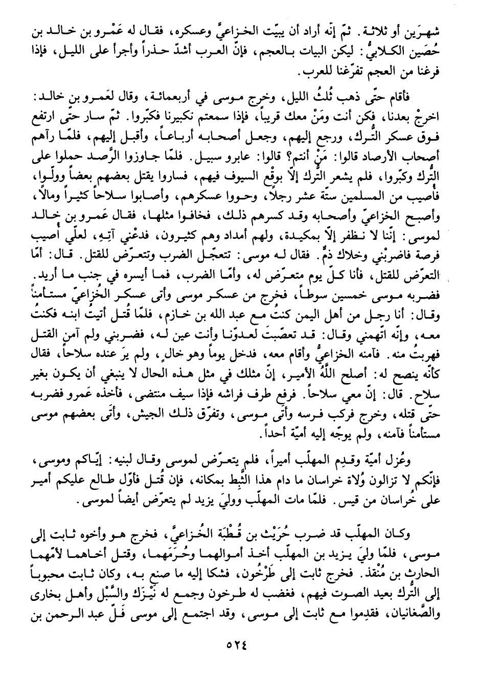 فَأَقَامَ حَتَّى ذَهَبَ ثُلُثُ اللَّيْلِ، وَخَرَجَ مُوسَى فِي أَرْبَعِمِائَةٍ وَقَالَ لِعَمْرِو بْنِ خَالِدٍ: اخْرُجْ بَعْدَنَا، فَكُنْ أَنْتَ وَمَنْ مَعَكَ قَرِيبًا، فَإِذَا سَمِعْتُمْ تَكْبِيرَنَا فَكَبِّرُوا. ثُمَّ سَارَ حَتَّى ارْتَفَعَ فَوْقَ عَسْكَرِ التُّرْكِ، وَرَجَعَ إِلَيْهِمْ، وَجَعَلَ أَصْحَابَهُ أَرْبَاعًا، وَأَقْبَلَ إِلَيْهِمْ، فَلَمَّا رَآهُمْ أَصْحَابُ الْأَرْصَادِ قَالُوا: مَنْ أَنْتُمْ؟ قَالُوا: عَابِرُو سَبِيلٍ. فَلَمَّا جَاوَزُوا الرَّصَدَ حَمَلُوا عَلَى التُّرْكِ وَكَبَّرُوا، فَلَمْ يَشْعُرِ التُّرْكُ إِلَّا بِوَقْعِ السُّيُوفِ فِيهِمْ، فَسَارُوا يَقْتُلُ بَعْضُهُمْ بَعْضًا وَوَلَّوْا، فَأُصِيبَ مِنَ الْمُسْلِمِينَ سِتَّةَ عَشَرَ رَجُلًا، وَحَوُوا عَسْكَرَهُمْ وَأَصَابُوا سِلَاحًا كَثِيرًا وَمَالًا، وَأَصْبَحَ الْخُزَاعِيُّ وَأَصْحَابُهُ وَقَدْ كَسْرَهُمْ ذَلِكَ، فَخَافُوا مِثْلَهَا، فَقَالَ عَمْرُو بْنُ خَالِدٍ لِمُوسَى: إِنَّنَا لَا نَظْفَرُ إِلَّا بِمَكِيدَةٍ، وَلَهُمْ أَمْدَادًا، وَهُمْ كَثِيرُونَ، فَدَعْنِي آتِهِ لَعَلِّي أُصِيبُ فُرْصَةً، فَاضْرِبْنِي وَخَلَاكَ ذَمٌّ. فَقَالَ لَهُ مُوسَى: تَتَعَجَّلُ الضَّرْبَ وَتَتَعَرَّضُ لِلْقَتْلِ. قَالَ: أَمَّا التَّعَرُّضُ لِلْقَتْلِ فَأَنَا كُلُّ يَوْمٍ مُتَعَرِّضٌ لَهُ، وَأَمَّا الضَّرْبُ فَمَا أَيْسَرَهُ فِي جَنْبِ مَا أُرِيدُ. فَضَرَبَهُ مُوسَى خَمْسِينَ سَوْطًا، فَخَرَجَ مِنْ عَسْكَرِ مُوسَى وَأَتَى عَسْكَرَ الْخُزَاعِيِّ مُسْتَأْمِنًا، وَقَالَ: أَنَا رَجُلٌ مِنْ أَهْلِ الْيَمَنِ كُنْتُ مَعَ عَبْدِ اللَّهِ بْنِ خَازِمٍ، فَلَمَّا قُتِلَ أَتَيْتُ ابْنَهُ فَكُنْتُ مَعَهُ، وَإِنَّهُ اتَّهَمَنِي وَقَالَ: قَدْ تَعَصَّبْتَ لِعَدُوِّنَا وَأَنْتَ عَيْنٌ لَهُ، فَضَرَبَنِي وَلَمْ آمَنِ الْقَتْلَ فَهَرَبْتُ مِنْهُ. فَآمَنَهُ الْخُزَاعِيُّ وَأَقَامَ مَعَهُ، فَدَخَلَ يَوْمًا وَهُوَ خَالٍ وَلَمْ يَرَ عِنْدَهُ سِلَاحًا، فَقَالَ كَأَنَّهُ يَنْصَحُ لَهُ: أَصْلَحَ اللَّهُ الْأَمِيرَ، إِنَّ مِثْلَكَ فِي مِثْلِ هَذِهِ الْحَالِ لَا يَنْبَغِي أَنْ يَكُونَ بِغَيْرِ سِلَاحٍ. قَالَ: إِنَّ مَعِي سِلَاحًا. فَرَفَعَ طَرَفَ فِرَاشِهِ فَإِذَا سَيْفٌ مُنْتَضًى، فَأَخَذَهُ عَمْرٌو فَضَرَبَهُ حَتَّى قَتَلَهُ، وَخَرَجَ فَرَكِبَ فَرَسَهُ وَأَتَى مُوسَى، وَتَفَرَّقَ ذَلِكَ الْجَيْشُ، وَأَتَى بَعْضُهُمْ مُوسَى مُسْتَأْمِنًا فَآمَنَهُ، وَلَمْ يُوَجِّهْ إِلَيْهِ أُمَيَّةُ أَحَدًا.