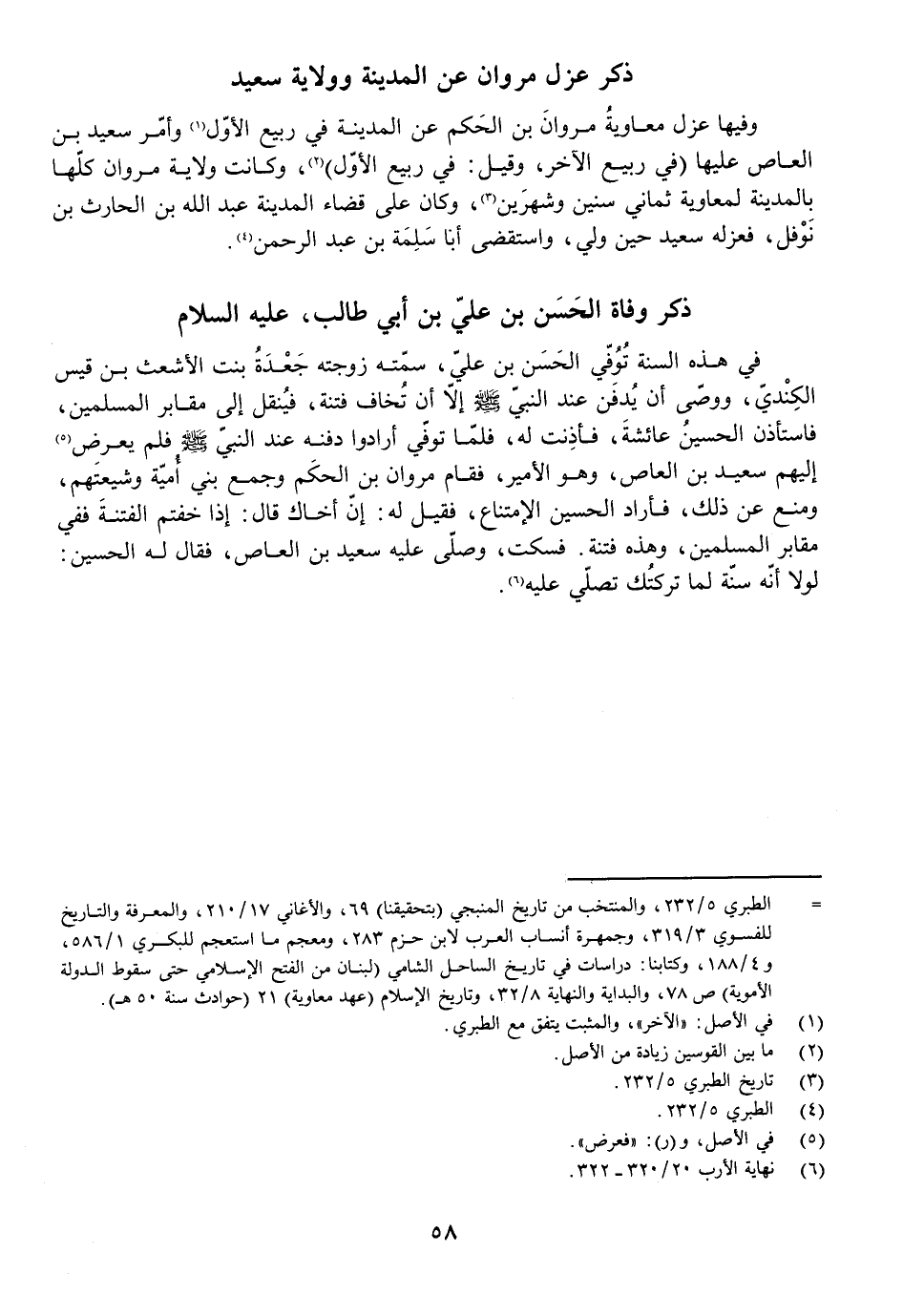 فِي هَذِهِ السَّنَةِ تُوُفِّيَ الْحَسَنُ بْنُ عَلِيٍّ، سَمَّتْهُ زَوْجَتُهُ جَعْدَةُ بِنْتُ الْأَشْعَثِ بْنِ قَيْسٍ الْكِنْدِيِّ، وَوَصَّى أَنْ يُدْفَنَ عِنْدَ النَّبِيِّ - صَلَّى اللَّهُ عَلَيْهِ وَسَلَّمَ - إِلَّا أَنْ تُخَافَ فِتْنَةٌ فَيُنْقَلُ إِلَى مَقَابِرِ الْمُسْلِمِينَ، فَاسْتَأْذَنَ الْحُسَيْنُ عَائِشَةَ فَأَذِنَتْ لَهُ، فَلَمَّا تُوُفِّيَ أَرَادُوا دَفْنَهُ عِنْدَ النَّبِيِّ - صَلَّى اللَّهُ عَلَيْهِ وَسَلَّمَ -، فَلَمْ يَعْرِضْ إِلَيْهِمْ سَعِيدُ بْنُ الْعَاصِ، وَهُوَ الْأَمِيرُ، فَقَامَ مَرْوَانُ بْنُ الْحَكَمِ وَجَمَعَ بَنِي أُمَيَّةَ وَشِيعَتَهُمْ وَمَنَعَ عَنْ ذَلِكَ، فَأَرَادَ الْحُسَيْنُ الِامْتِنَاعَ فَقِيلَ لَهُ: إِنَّ أَخَاكَ قَالَ: إِذَا خِفْتُمُ الْفِتْنَةَ فَفِي مَقَابِرِ الْمُسْلِمِينَ، وَهَذِهِ فِتْنَةٌ. فَسَكَتَ، وَصَلَّى عَلَيْهِ سَعِيدُ بْنُ الْعَاصِ، فَقَالَ لَهُ الْحُسَيْنُ: لَوْلَا أَنَّهُ سُنَّةٌ لَمَا تَرَكْتُكَ تُصَلِّي عَلَيْهِ.
